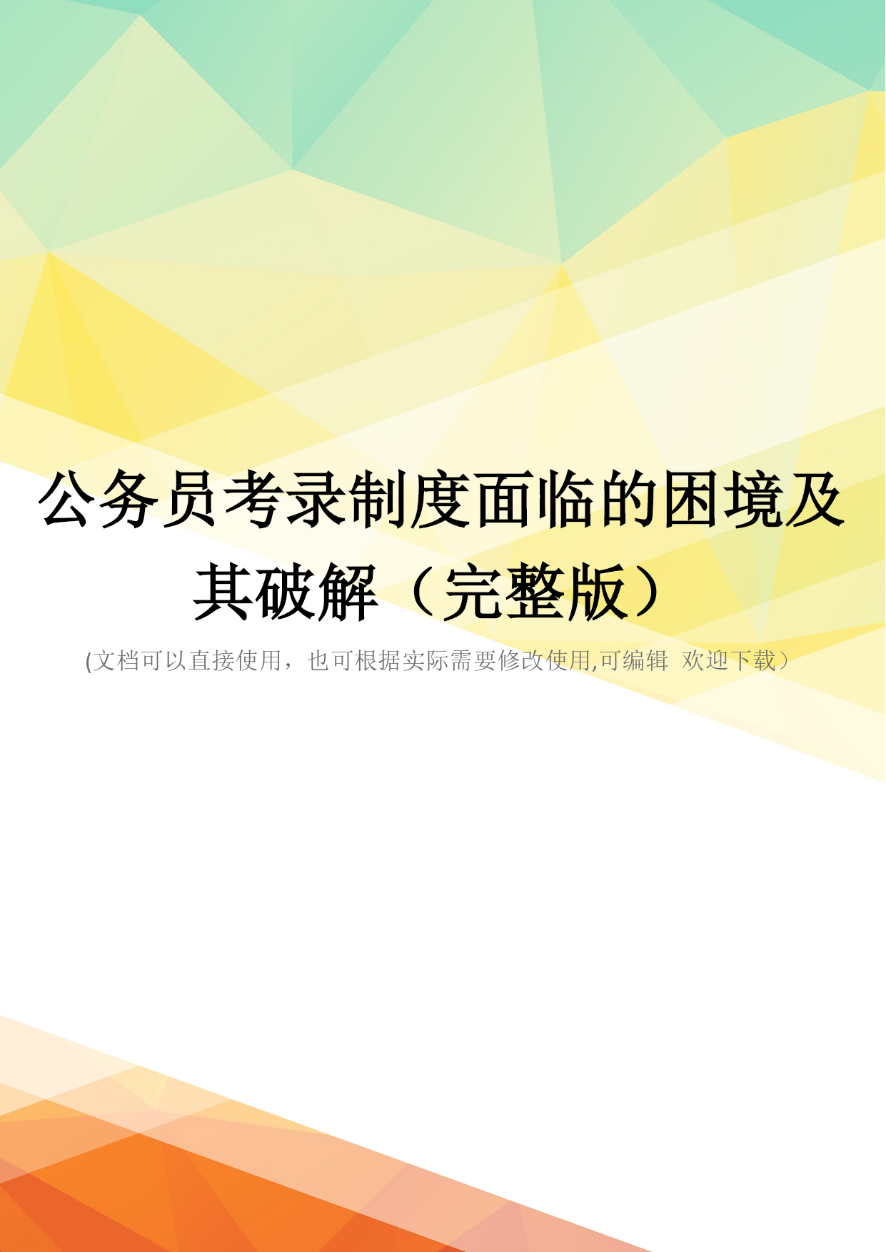 公务员考录制度面临的困境及其破解(完整版)(文档可以直接使用,也可根据实际需要修改使用,可编辑欢迎下载)公务员考录制度面临的困境及其破解年第期湖南行政学院学报双月刊.,.总第期公共行政?公务员考录制度面临的困境及其破解袁忠中共广东省委党校,广东广州摘要:年的实践表明,作为公务员制度关键性构件的我国公务员考录制度在取得突破性进展的同时,面临着缺乏科学分类、考试成本过高、考试程序不合理、不正之风蔓延等问题的困扰。其根本原因在于,现行考试制度性质上属于职位竞争考试,采取一轮制考试模式,走的是专才路线,与我国的国