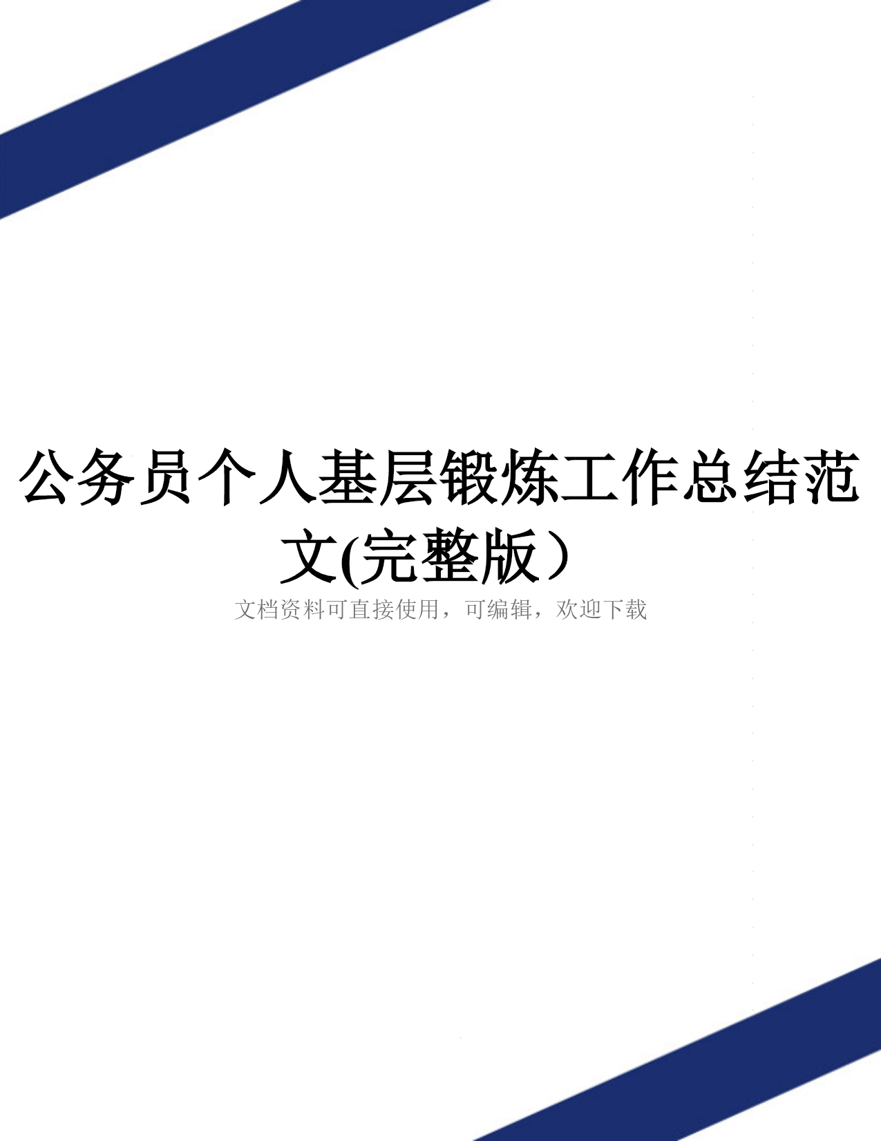 公务员个人基层锻炼工作总结范文(完整版)文档资料可直接使用,可编辑,欢迎下载公务员个人基层锻炼工作总结基层锻炼工作总结根据___安排,我于___年___月___日起到___社区进行基层锻炼,至今一年的锻炼已经结束。作为一名没有基层工作经历的年轻人,我十分珍惜这次宝贵的锻炼学习机会,在市、区___、政法委的关怀下,在街道、社区领导的正确指导和各位同事们的支持帮助下,我认真学习,积极参与,深入思考,在各方面都有了较大的提高。下面向各位领导汇报一下我锻炼期间的一些体会。一、工作收获及个人体验1、珍惜机遇,锻炼提