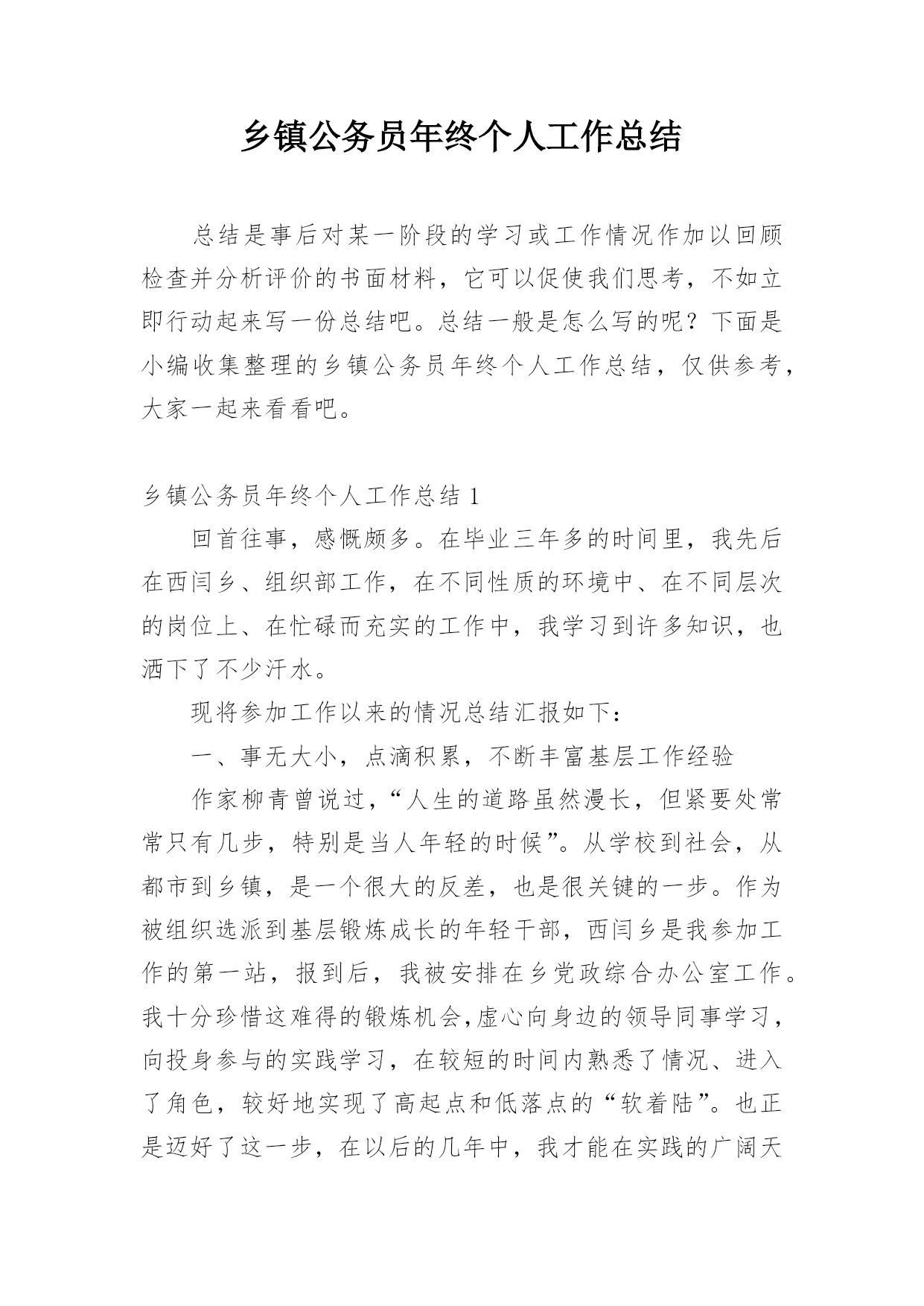 乡镇公务员年终个人工作总结总结是事后对某一阶段的学习或工作情况作加以回顾检查并分析评价的书面材料,它可以促使我们思考,不如立即行动起来写一份总结吧。总结一般是怎么写的呢?下面是小编收集整理的乡镇公务员年终个人工作总结,仅供参考,大家一起来看看吧。乡镇公务员年终个人工作总结1回首往事,感慨颇多。在毕业三年多的时间里,我先后在西闫乡、组织部工作,在不同性质的环境中、在不同层次的岗位上、在忙碌而充实的工作中,我学习到许多知识,也洒下了不少汗水。现将参加工作以来的情况总结汇报如下:一、事无大小,点滴积累,不断丰富