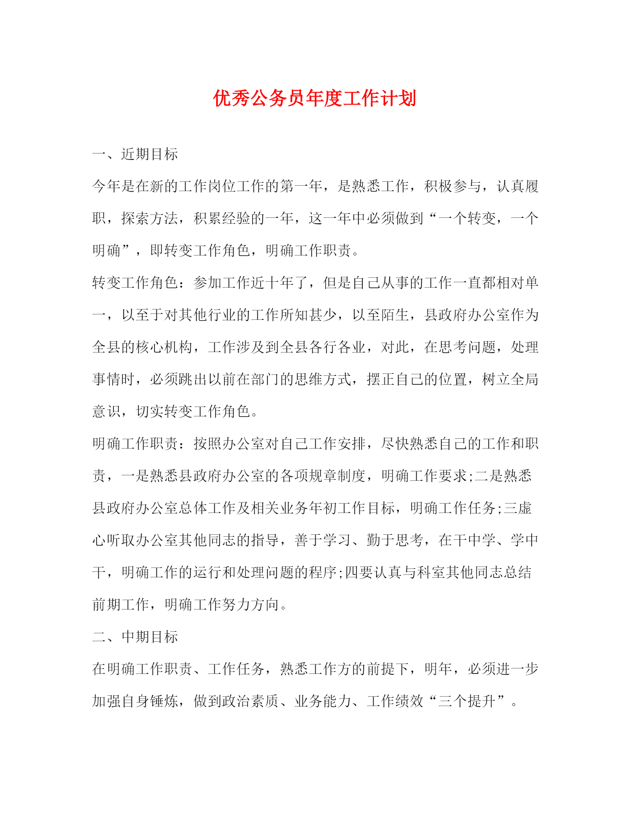 PAGE此资料由网络收集而来,如有侵权请告知上传者立即删除。资料共分享,我们负责传递知识。优秀公务员年度工作计划一、近期目标今年是在新的工作岗位工作的第一年,是熟悉工作,积极参与,认真履职,探索方法,积累经验的一年,这一年中必须做到“一个转变,一个明确”,即转变工作角色,明确工作职责。转变工作角色:参加工作近十年了,但是自己从事的工作一直都相对单一,以至于对其他行业的工作所知甚少,以至陌生,县政府办公室作为全县的核心机构,工作涉及到全县各行各业,对此,在思考问题,处理事情时,必须跳出以前在部门的思维