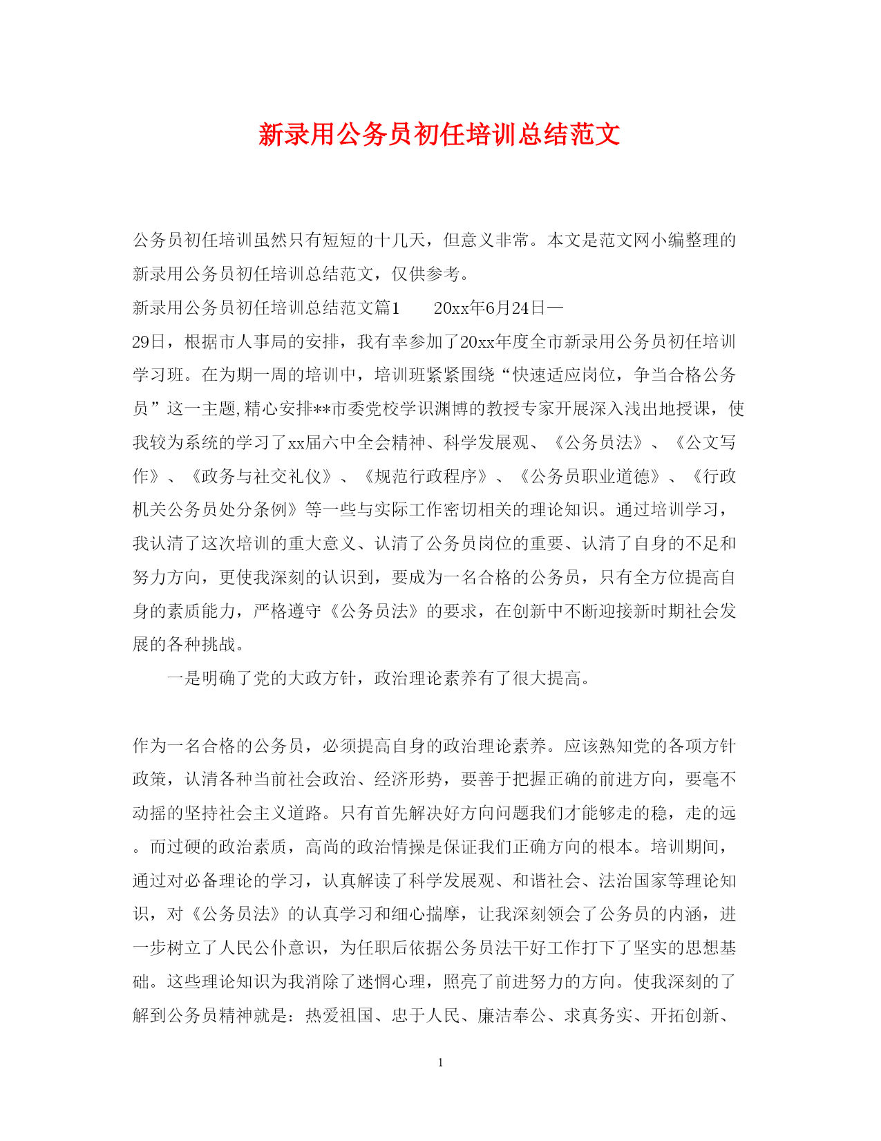 此资料由网络收集而来,如有侵权请告知上传者立即删除。资料共分享,我们负责传递知识。PAGEPAGE9新录用公务员初任培训总结范文公务员初任培训虽然只有短短的十几天,但意义非常。本文是范文网小编整理的新录用公务员初任培训总结范文,仅供参考。新录用公务员初任培训总结范文篇120xx年6月24日—29日,根据市人事局的安排,我有幸参加了20xx年度全市新录用公务员初任培训学习班。在为期一周的培训中,培训班紧紧围绕“快速适应岗位,争当合格公务员”这一主题,精心安排**市委党校学识渊博的教授专家开展深入
