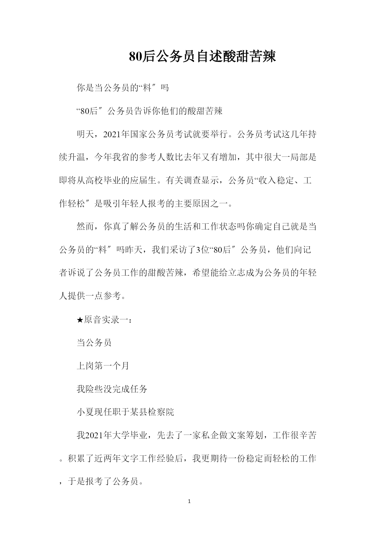 PAGEPAGE680后公务员自述酸甜苦辣你是当公务员的“料〞吗“80后〞公务员告诉你他们的酸甜苦辣明天,2021年国家公务员考试就要举行。公务员考试这几年持续升温,今年我省的参考人数比去年又有增加,其中很大一局部是即将从高校毕业的应届生。有关调查显示,公务员“收入稳定、工作轻松〞是吸引年轻人报考的主要原因之一。然而,你真了解公务员的生活和工作状态吗你确定自己就是当公务员的“料〞吗昨天,我们采访了3位“80后〞公务员,他们向记者诉说了公务员工作的甜酸苦辣,希望能给立志成为公务员的年轻人提供一点