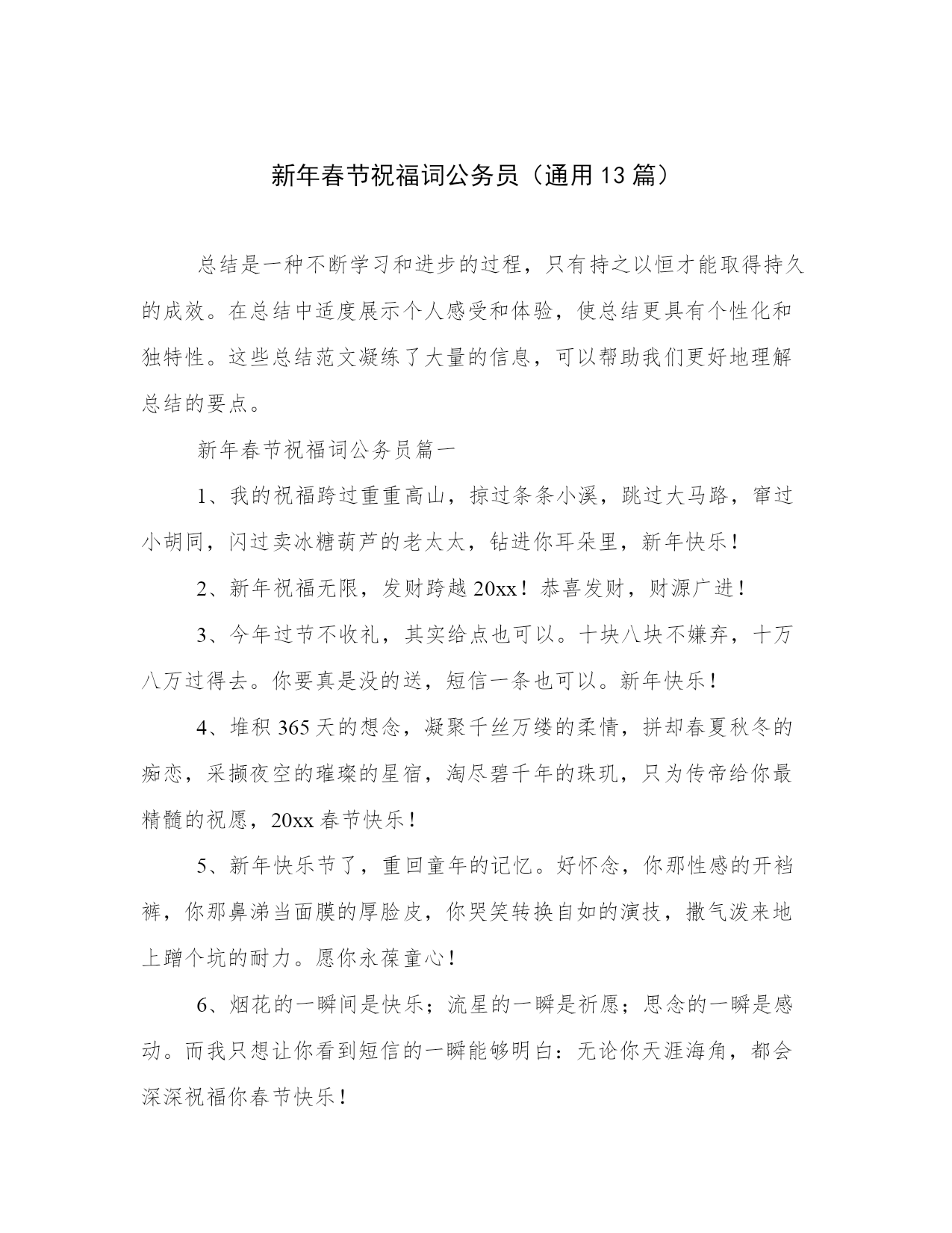 新年春节祝福词公务员(通用13篇)总结是一种不断学习和进步的过程,只有持之以恒才能取得持久的成效。在总结中适度展示个人感受和体验,使总结更具有个性化和独特性。这些总结范文凝练了大量的信息,可以帮助我们更好地理解总结的要点。新年春节祝福词公务员篇一1、我的祝福跨过重重高山,掠过条条小溪,跳过大马路,窜过小胡同,闪过卖冰糖葫芦的老太太,钻进你耳朵里,新年快乐!2、新年祝福无限,发财跨越20xx!恭喜发财,财源广进!3、今年过节不收礼,其实给点也可以。十块八块不嫌弃,十万八万过得去。你要真是没的送,短信一条也可