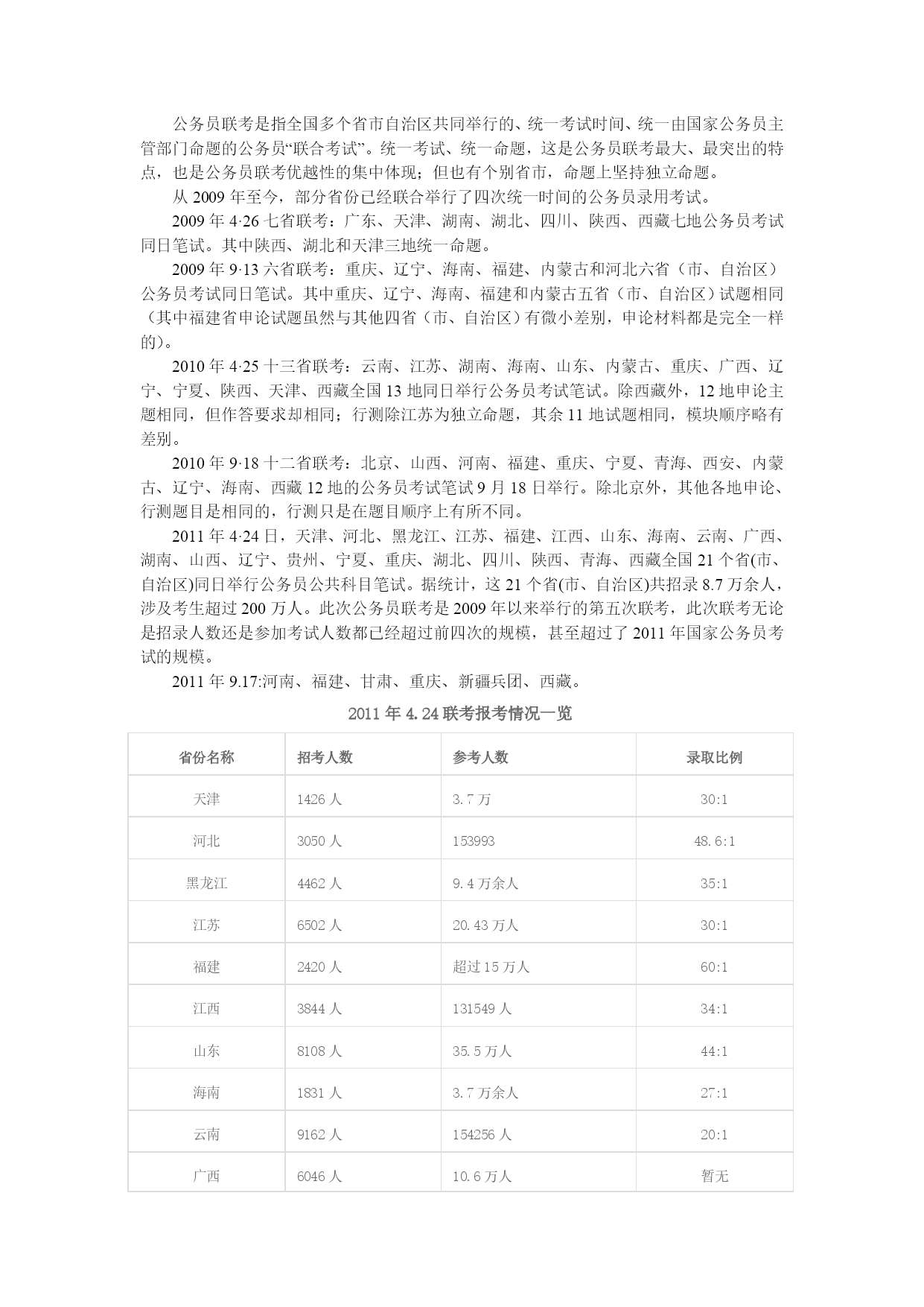 公务员联考是指全国多个省市自治区共同举行的、统一考试时间、统一由国家公务员主管部门命题的公务员“联合考试”。统一考试、统一命题,这是公务员联考最大、最突出的特点,也是公务员联考优越性的集中体现;但也有个别省市,命题上坚持独立命题。从2009年至今,部分省份已经联合举行了四次统一时间的公务员录用考试。2009年4·26七省联考:广东、天津、湖南、湖北、四川、陕西、西藏七地公务员考试同日笔试。其中陕西、湖北和天津三地统一命题。2009年9·13六省联考:重庆、辽宁、海南、福建、内蒙古和河北六省(市、自治区)公