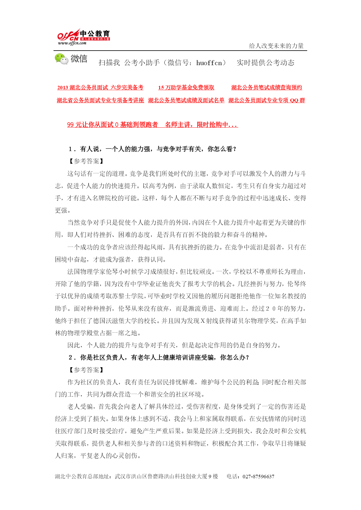 给人改变未来的力量湖北中公教育总部地址:武汉市洪山区鲁磨路洪山科技创业大厦9楼电话:027-87596637扫描我公考小助手(微信号:huoffcn)实时提供公考动态HYPERLINK"http://hu.offcn.com/zg/2013skmszt/index.html"\t"_blank"2013湖北公务员面试六步完美备考HYPERLINK"http://hu.offcn.com/zg/2013skcj/index.html"\t"_blank"15万助学基金免费领取HYPERLINK