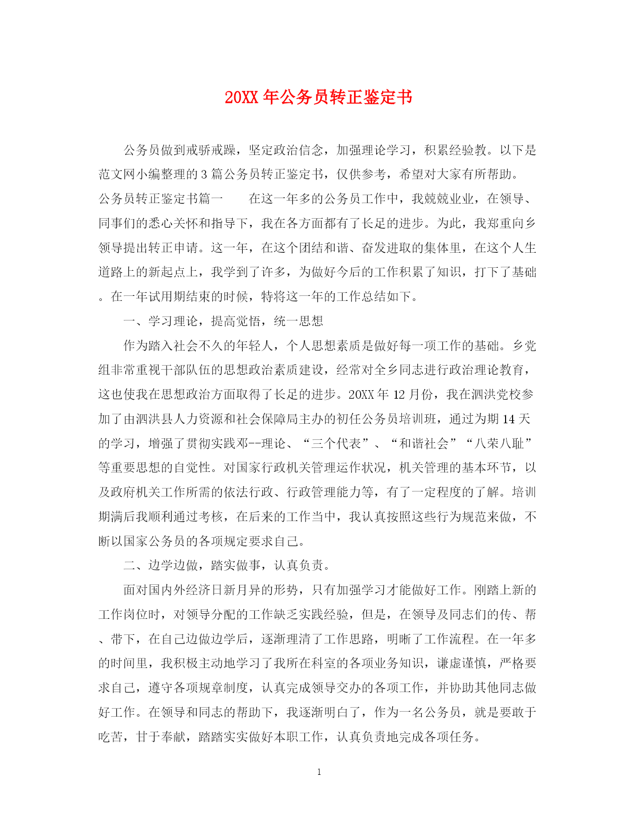 此资料由网络收集而来,如有侵权请告知上传者立即删除。资料共分享,我们负责传递知识。PAGEPAGE520XX年公务员转正鉴定书公务员做到戒骄戒躁,坚定政治信念,加强理论学习,积累经验教。以下是范文网小编整理的3篇公务员转正鉴定书,仅供参考,希望对大家有所帮助。公务员转正鉴定书篇一在这一年多的公务员工作中,我兢兢业业,在领导、同事们的悉心关怀和指导下,我在各方面都有了长足的进步。为此,我郑重向乡领导提出转正申请。这一年,在这个团结和谐、奋发进取的集体里,在这个人生道路上的新起点上,我学到了许多,
