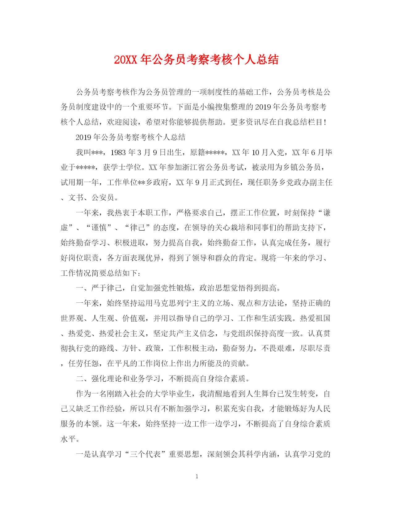 此资料由网络收集而来,如有侵权请告知上传者立即删除。资料共分享,我们负责传递知识。PAGEPAGE520XX年公务员考察考核个人总结公务员考察考核作为公务员管理的一项制度性的基础工作,公务员考核是公务员制度建设中的一个重要环节。下面是小编搜集整理的2019年公务员考察考核个人总结,欢迎阅读,希望对你能够提供帮助。更多资讯尽在自我总结栏目!2019年公务员考察考核个人总结我叫***,1983年3月9日出生,原籍*****,XX年10月入党,XX年6月毕业于*****,获学士学位。XX年参加浙江省