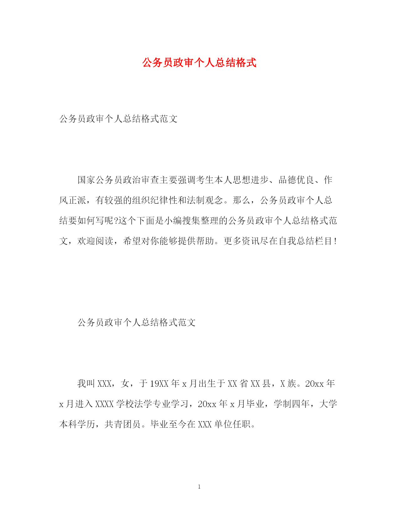 此资料由网络收集而来,如有侵权请告知上传者立即删除。资料共分享,我们负责传递知识。PAGEPAGE8公务员政审个人总结格式公务员政审个人总结格式范文国家公务员政治审查主要强调考生本人思想进步、品德优良、作风正派,有较强的组织纪律性和法制观念。那么,公务员政审个人总结要如何写呢?这个下面是小编搜集整理的公务员政审个人总结格式范文,欢迎阅读,希望对你能够提供帮助。更多资讯尽在自我总结栏目!公务员政审个人总结格式范文我叫XXX,女,于19XX年x月出生于XX省XX县,X族。20xx年x月进入XXXX
