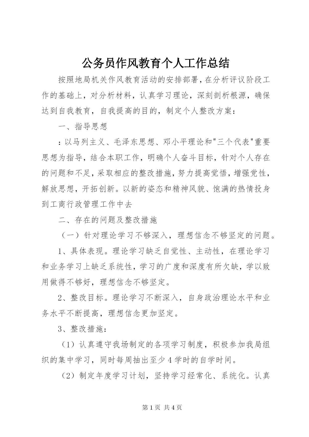 第PAGE\*Arabic\*MERGEFORMAT4页共NUMPAGES\*MERGEFORMAT4页公务员作风教育个人工作总结按照地局机关作风教育活动的安排部署,在分析评议阶段工作的基础上,对分析材料,认真学习理论,深刻剖析根源,确保达到自我教育,自我提高的目的,制定个人整改方案:一、指导思想:以马列主义、毛泽东思想、邓小平理论和"三个代表"重要思想为指导,结合本职工作,明确个人奋斗目标,针对个人存在的问题和不足,采取相应的整改措施,努力提高觉悟,增强党性,解放思想,开拓创新。以新的姿态和