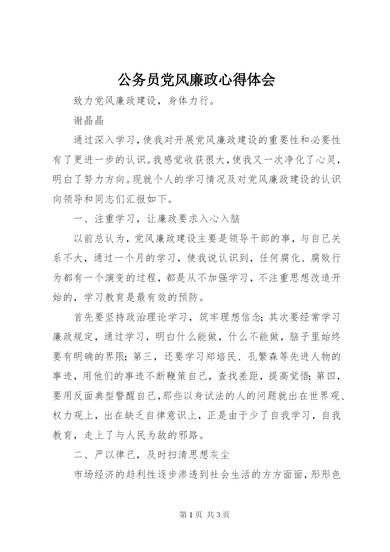 第PAGE\*Arabic\*MERGEFORMAT3页共NUMPAGES\*MERGEFORMAT3页公务员党风廉政心得体会致力党风廉政建设,身体力行。谢晶晶通过深入学习,使我对开展党风廉政建设的重要性和必要性有了更进一步的认识。我感觉收获很大,使我又一次净化了心灵,明白了努力方向。现就个人的学习情况及对党风廉政建设的认识向领导和同志们汇报如下。一、注重学习,让廉政要求入心入脑以前总认为,党风廉政建设主要是领导干部的事,与自己关系不大,通过一个月的学习,使我说认识到,任何腐化、腐败行为都有一