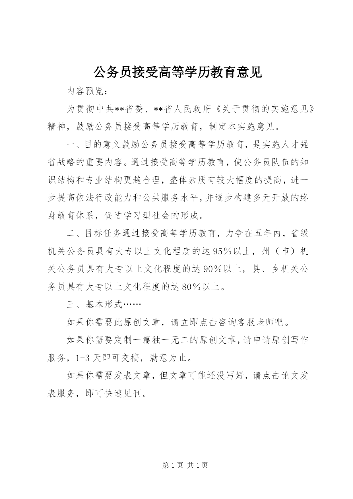 第PAGE\*Arabic\*MERGEFORMAT1页共NUMPAGES\*MERGEFORMAT1页公务员接受高等学历教育意见内容预览:为贯彻中共**省委、**省人民政府《关于贯彻的实施意见》精神,鼓励公务员接受高等学历教育,制定本实施意见。一、目的意义鼓励公务员接受高等学历教育,是实施人才强省战略的重要内容。通过接受高等学历教育,使公务员队伍的知识结构和专业结构更趋合理,整体素质有较大幅度的提高,进一步提高依法行政能力和公共服务水平,并逐步构建多元开放的终身教育体系,促进学习型社会的形成