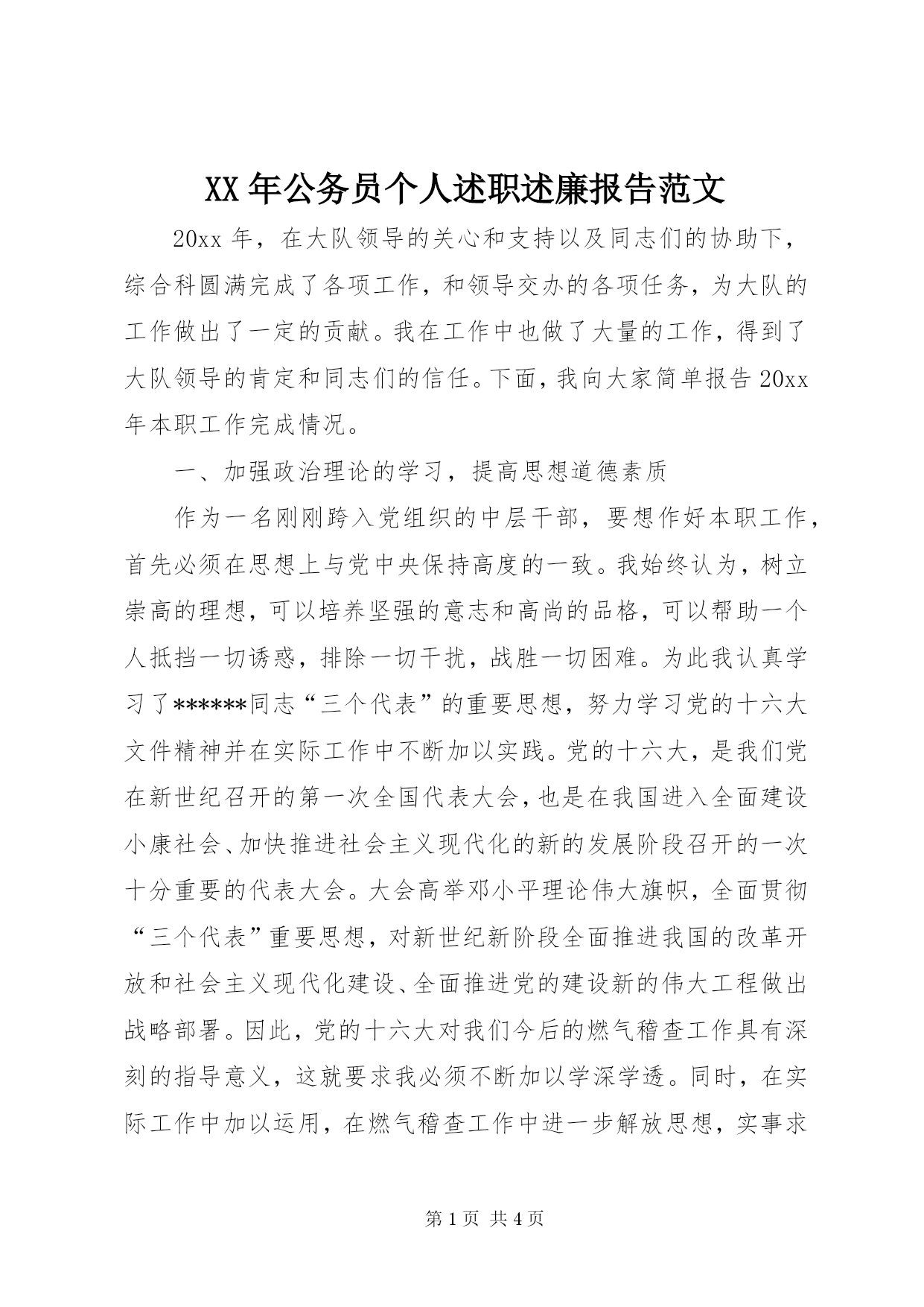 第PAGE\*Arabic\*MERGEFORMAT4页共NUMPAGES\*MERGEFORMAT4页XX年公务员个人述职述廉报告范文20xx年,在大队领导的关心和支持以及同志们的协助下,综合科圆满完成了各项工作,和领导交办的各项任务,为大队的工作做出了一定的贡献。我在工作中也做了大量的工作,得到了大队领导的肯定和同志们的信任。下面,我向大家简单报告20xx年本职工作完成情况。一、加强政治理论的学习,提高思想道德素质作为一名刚刚跨入党组织的中层干部,要想作好本职工作,首先必须在思想上与党中央