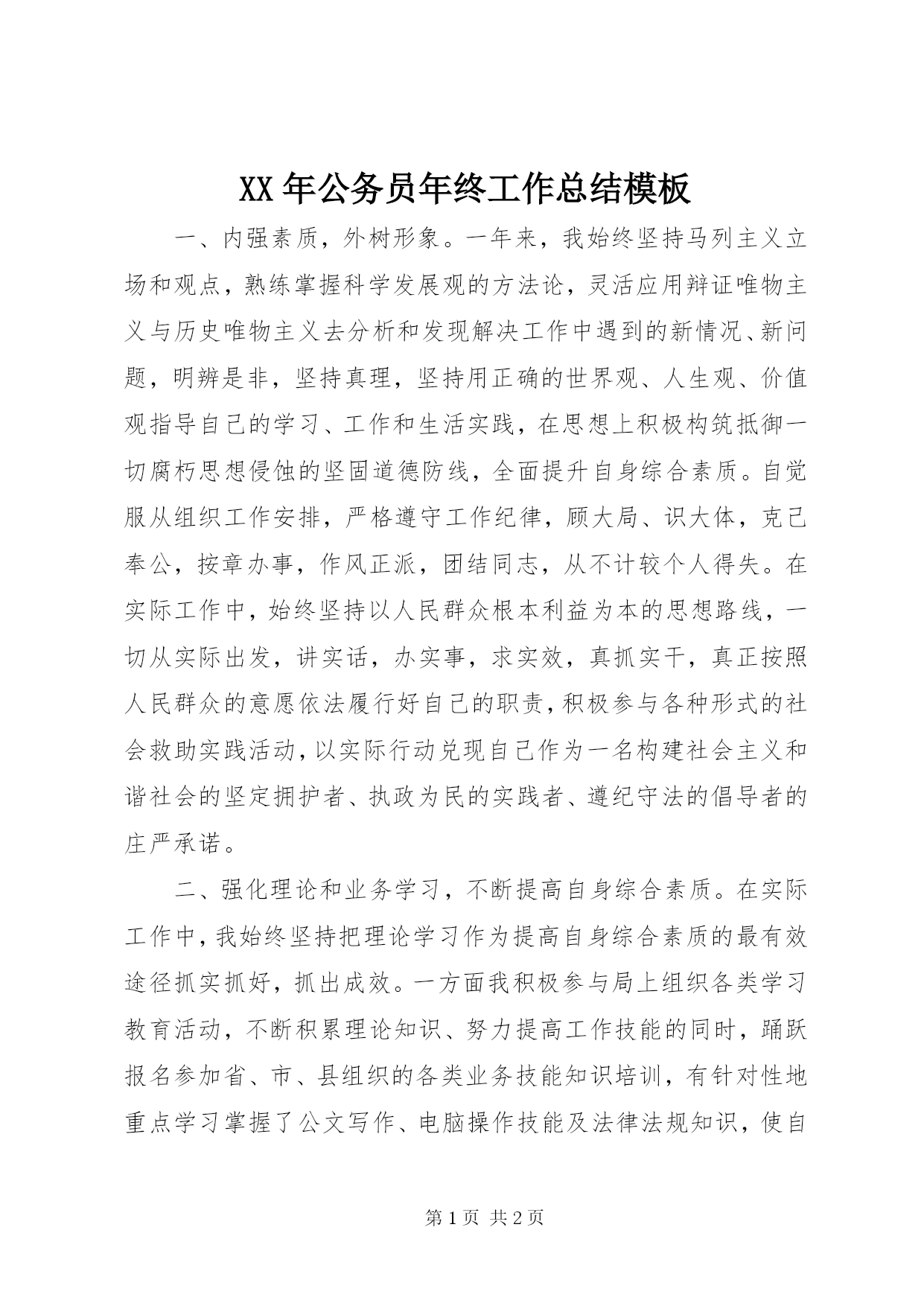 第PAGE\*Arabic\*MERGEFORMAT2页共NUMPAGES\*MERGEFORMAT2页XX年公务员年终工作总结模板一、内强素质,外树形象。一年来,我始终坚持马列主义立场和观点,熟练掌握科学发展观的方法论,灵活应用辩证唯物主义与历史唯物主义去分析和发现解决工作中遇到的新情况、新问题,明辨是非,坚持真理,坚持用正确的世界观、人生观、价值观指导自己的学习、工作和生活实践,在思想上积极构筑抵御一切腐朽思想侵蚀的坚固道德防线,全面提升自身综合素质。自觉服从组织工作安排,严格遵守工作纪律