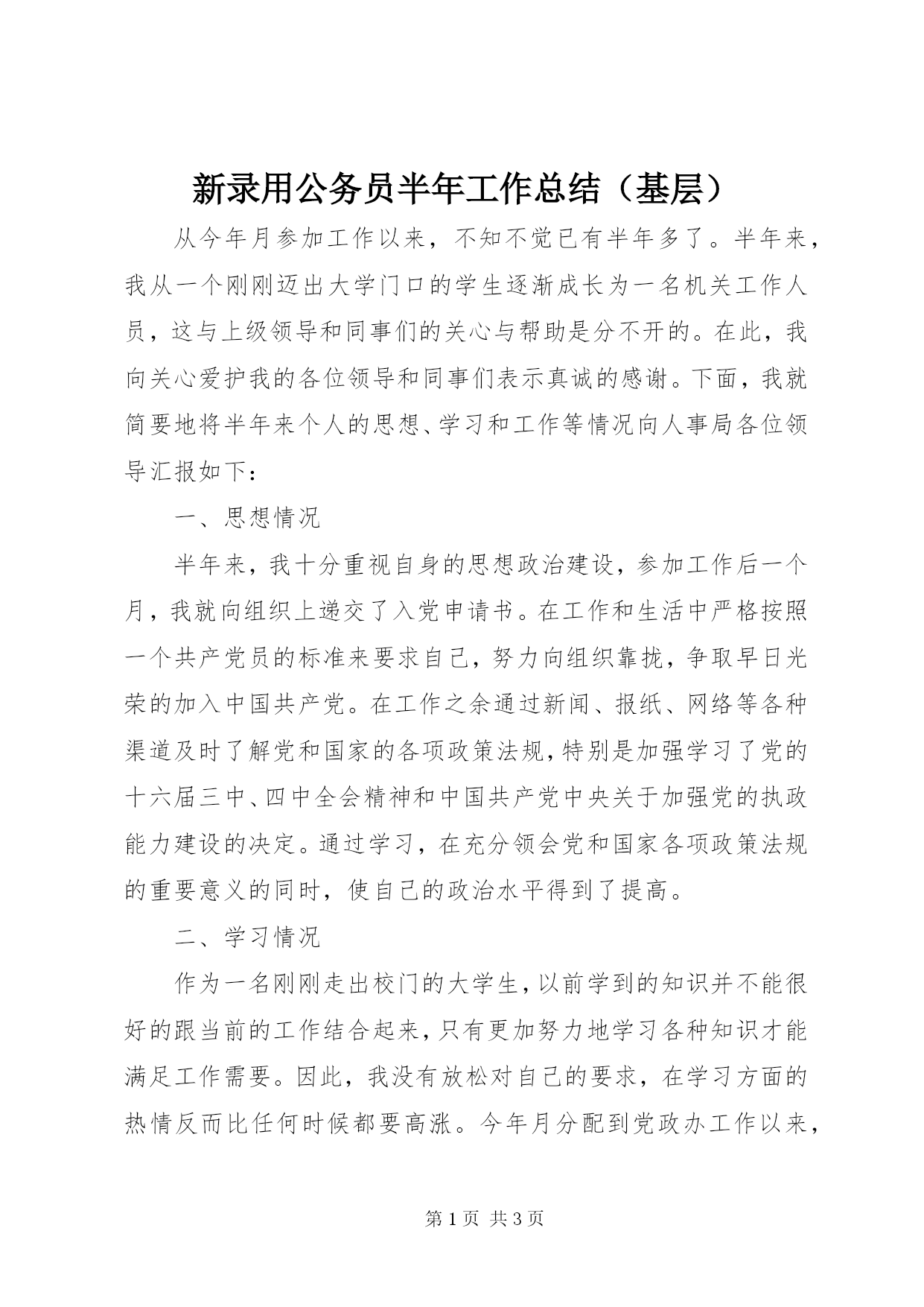 第PAGE\*Arabic\*MERGEFORMAT3页共NUMPAGES\*MERGEFORMAT3页新录用公务员半年工作总结(基层)从今年月参加工作以来,不知不觉已有半年多了。半年来,我从一个刚刚迈出大学门口的学生逐渐成长为一名机关工作人员,这与上级领导和同事们的关心与帮助是分不开的。在此,我向关心爱护我的各位领导和同事们表示真诚的感谢。下面,我就简要地将半年来个人的思想、学习和工作等情况向人事局各位领导汇报如下:一、思想情况半年来,我十分重视自身的思想政治建设,参加工作后一个月,我就向组