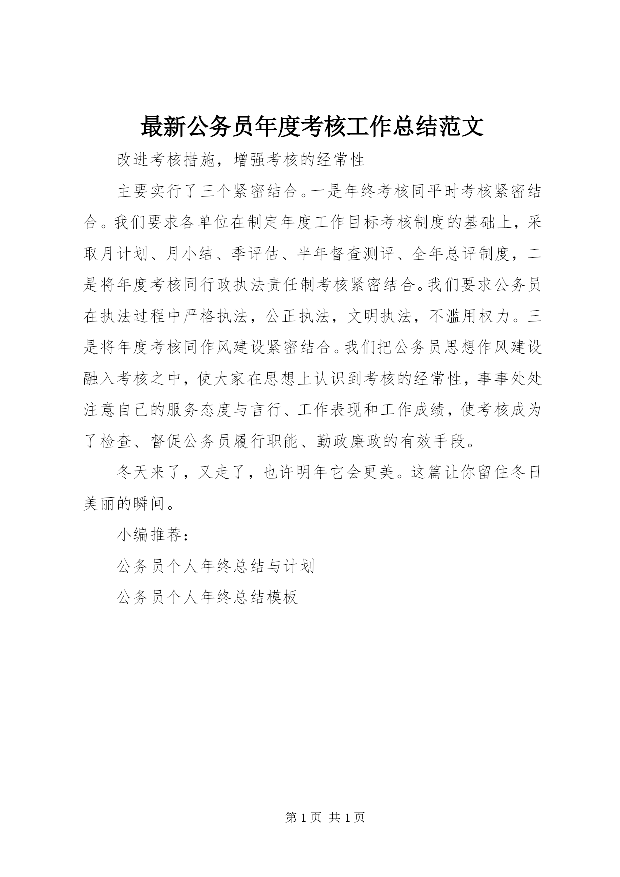 第PAGE\*Arabic\*MERGEFORMAT1页共NUMPAGES\*MERGEFORMAT1页最新公务员年度考核工作总结范文改进考核措施,增强考核的经常性主要实行了三个紧密结合。一是年终考核同平时考核紧密结合。我们要求各单位在制定年度工作目标考核制度的基础上,采取月计划、月小结、季评估、半年督查测评、全年总评制度,二是将年度考核同行政执法责任制考核紧密结合。我们要求公务员在执法过程中严格执法,公正执法,文明执法,不滥用权力。三是将年度考核同作风建设紧密结合。我们把公务员思想作风建设融