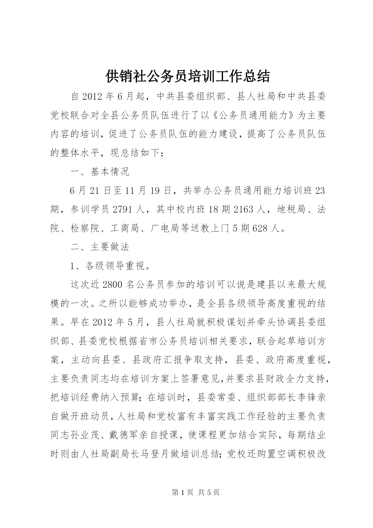第PAGE\*Arabic\*MERGEFORMAT5页共NUMPAGES\*MERGEFORMAT5页供销社公务员培训工作总结自2012年6月起,中共县委组织部、县人社局和中共县委党校联合对全县公务员队伍进行了以《公务员通用能力》为主要内容的培训,促进了公务员队伍的能力建设,提高了公务员队伍的整体水平,现总结如下:一、基本情况6月21日至11月19日,共举办公务员通用能力培训班23期,参训学员2791人,其中校内班18期2163人,地税局、法院、检察院、工商局、广电局等送教上门5期628人。