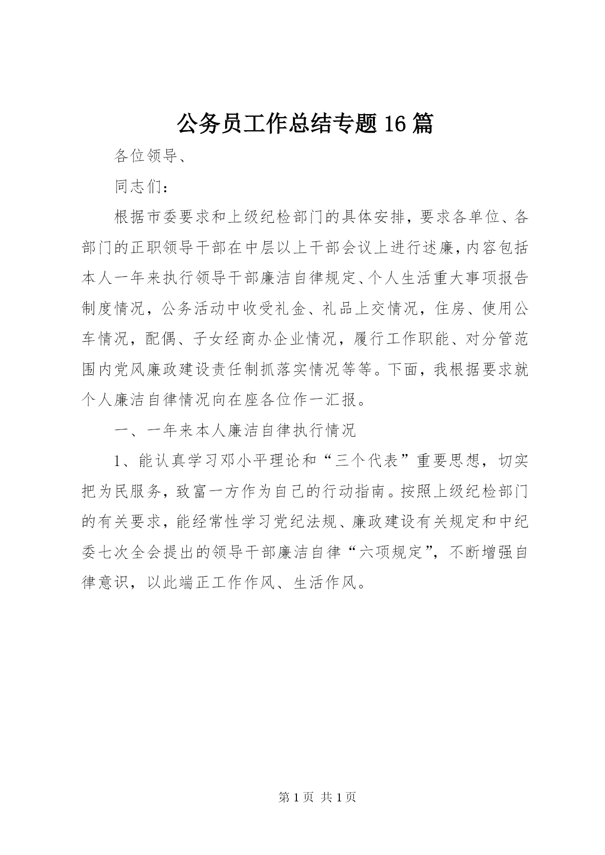 第PAGE\*Arabic\*MERGEFORMAT1页共NUMPAGES\*MERGEFORMAT1页公务员工作总结专题16篇各位领导、同志们:根据市委要求和上级纪检部门的具体安排,要求各单位、各部门的正职领导干部在中层以上干部会议上进行述廉,内容包括本人一年来执行领导干部廉洁自律规定、个人生活重大事项报告制度情况,公务活动中收受礼金、礼品上交情况,住房、使用公车情况,配偶、子女经商办企业情况,履行工作职能、对分管范围内党风廉政建设责任制抓落实情况等等。下面,我根据要求就个人廉洁自律情况向在