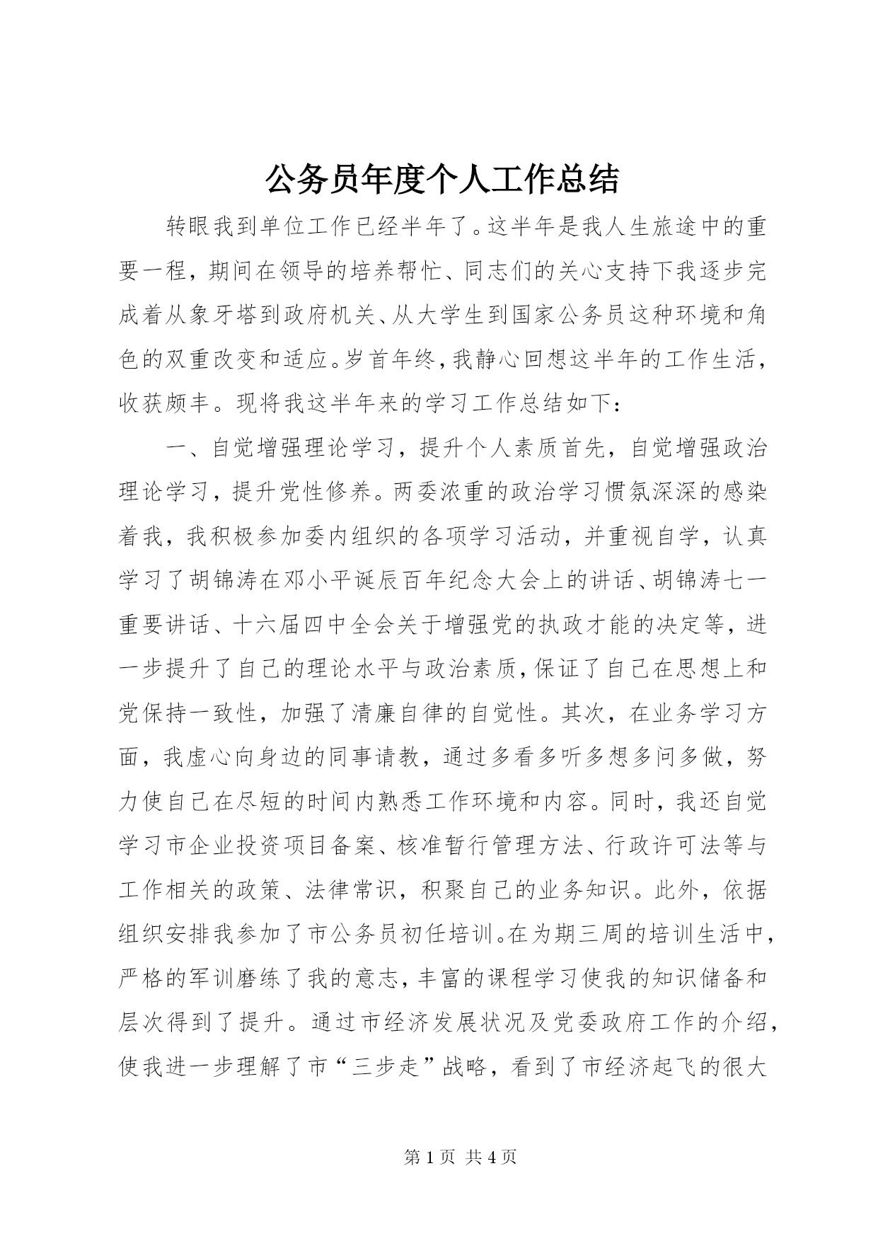 第PAGE\*Arabic\*MERGEFORMAT4页共NUMPAGES\*MERGEFORMAT4页公务员年度个人工作总结转眼我到单位工作已经半年了。这半年是我人生旅途中的重要一程,期间在领导的培养帮忙、同志们的关心支持下我逐步完成着从象牙塔到政府机关、从大学生到国家公务员这种环境和角色的双重改变和适应。岁首年终,我静心回想这半年的工作生活,收获颇丰。现将我这半年来的学习工作总结如下:一、自觉增强理论学习,提升个人素质首先,自觉增强政治理论学习,提升党性修养。两委浓重的政治学习惯氛深深的感