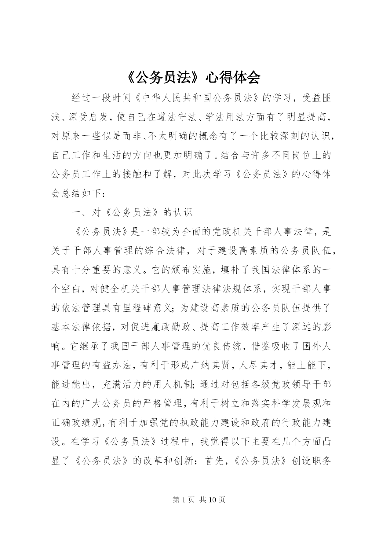 第PAGE\*Arabic\*MERGEFORMAT10页共NUMPAGES\*MERGEFORMAT10页《公务员法》心得体会经过一段时间《中华人民共和国公务员法》的学习,受益匪浅、深受启发,使自己在遵法守法、学法用法方面有了明显提高,对原来一些似是而非、不太明确的概念有了一个比较深刻的认识,自己工作和生活的方向也更加明确了。结合与许多不同岗位上的公务员工作上的接触和了解,对此次学习《公务员法》的心得体会总结如下:一、对《公务员法》的认识《公务员法》是一部较为全面的党政机关干部人事法律,是关
