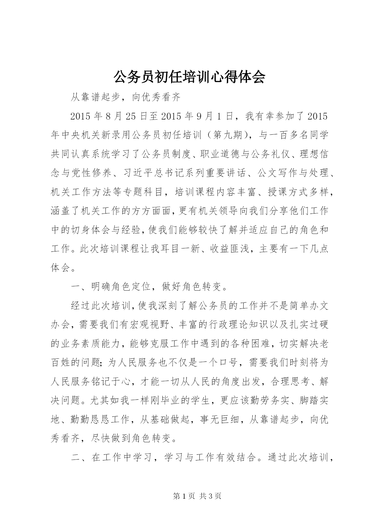 第PAGE\*Arabic\*MERGEFORMAT3页共NUMPAGES\*MERGEFORMAT3页公务员初任培训心得体会从靠谱起步,向优秀看齐2015年8月25日至2015年9月1日,我有幸参加了2015年中央机关新录用公务员初任培训(第九期),与一百多名同学共同认真系统学习了公务员制度、职业道德与公务礼仪、理想信念与党性修养、习近平总书记系列重要讲话、公文写作与处理、机关工作方法等专题科目,培训课程内容丰富、授课方式多样,涵盖了机关工作的方方面面,更有机关领导向我们分享他们工作中的切身