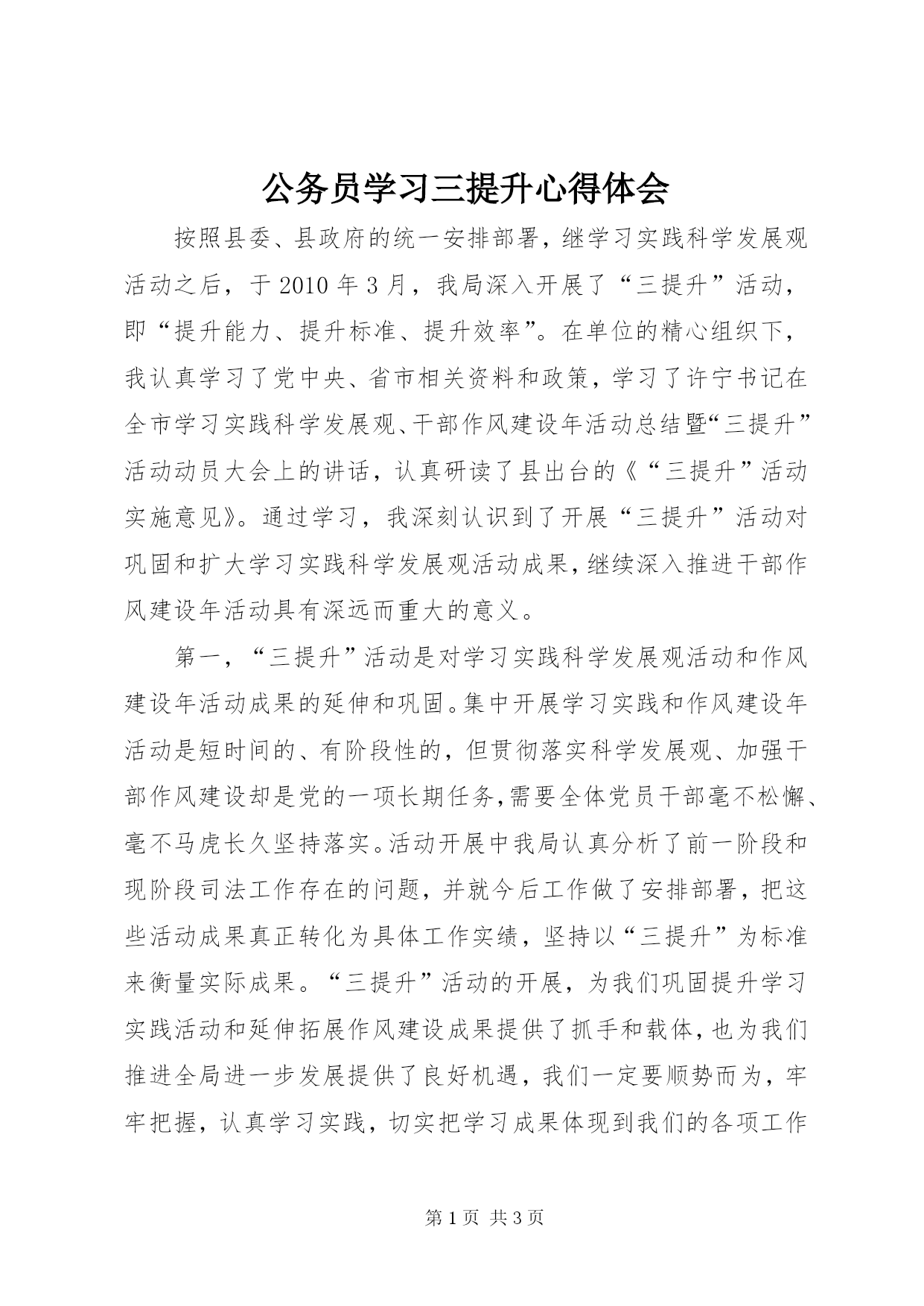 第PAGE\*Arabic\*MERGEFORMAT3页共NUMPAGES\*MERGEFORMAT3页公务员学习三提升心得体会按照县委、县政府的统一安排部署,继学习实践科学发展观活动之后,于2010年3月,我局深入开展了“三提升”活动,即“提升能力、提升标准、提升效率”。在单位的精心组织下,我认真学习了党中央、省市相关资料和政策,学习了许宁书记在全市学习实践科学发展观、干部作风建设年活动总结暨“三提升”活动动员大会上的讲话,认真研读了县出台的《“三提升”活动实施意见》。通过学习,我深刻认识到