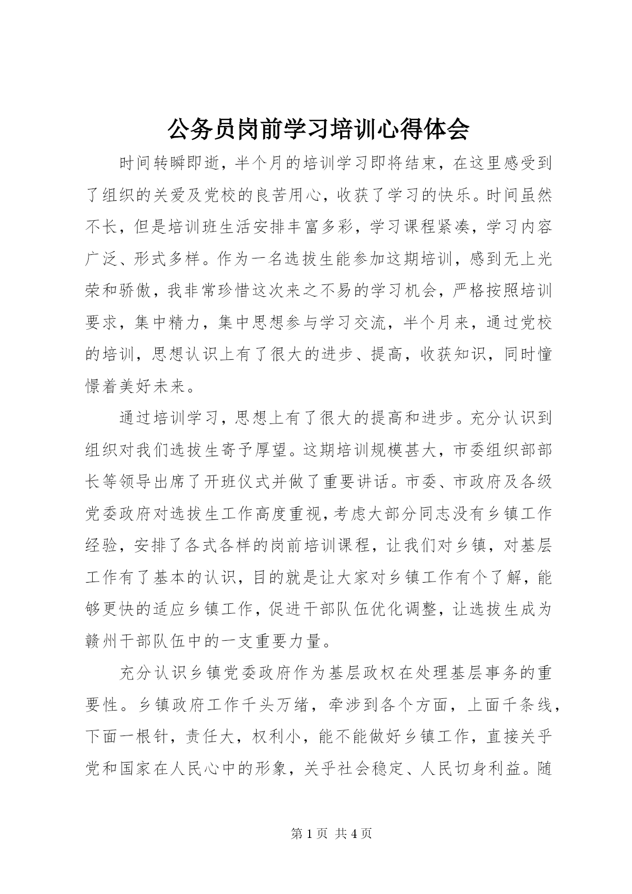 第PAGE\*Arabic\*MERGEFORMAT4页共NUMPAGES\*MERGEFORMAT4页公务员岗前学习培训心得体会时间转瞬即逝,半个月的培训学习即将结束,在这里感受到了组织的关爱及党校的良苦用心,收获了学习的快乐。时间虽然不长,但是培训班生活安排丰富多彩,学习课程紧凑,学习内容广泛、形式多样。作为一名选拔生能参加这期培训,感到无上光荣和骄傲,我非常珍惜这次来之不易的学习机会,严格按照培训要求,集中精力,集中思想参与学习交流,半个月来,通过党校的培训,思想认识上有了很大的进步、提