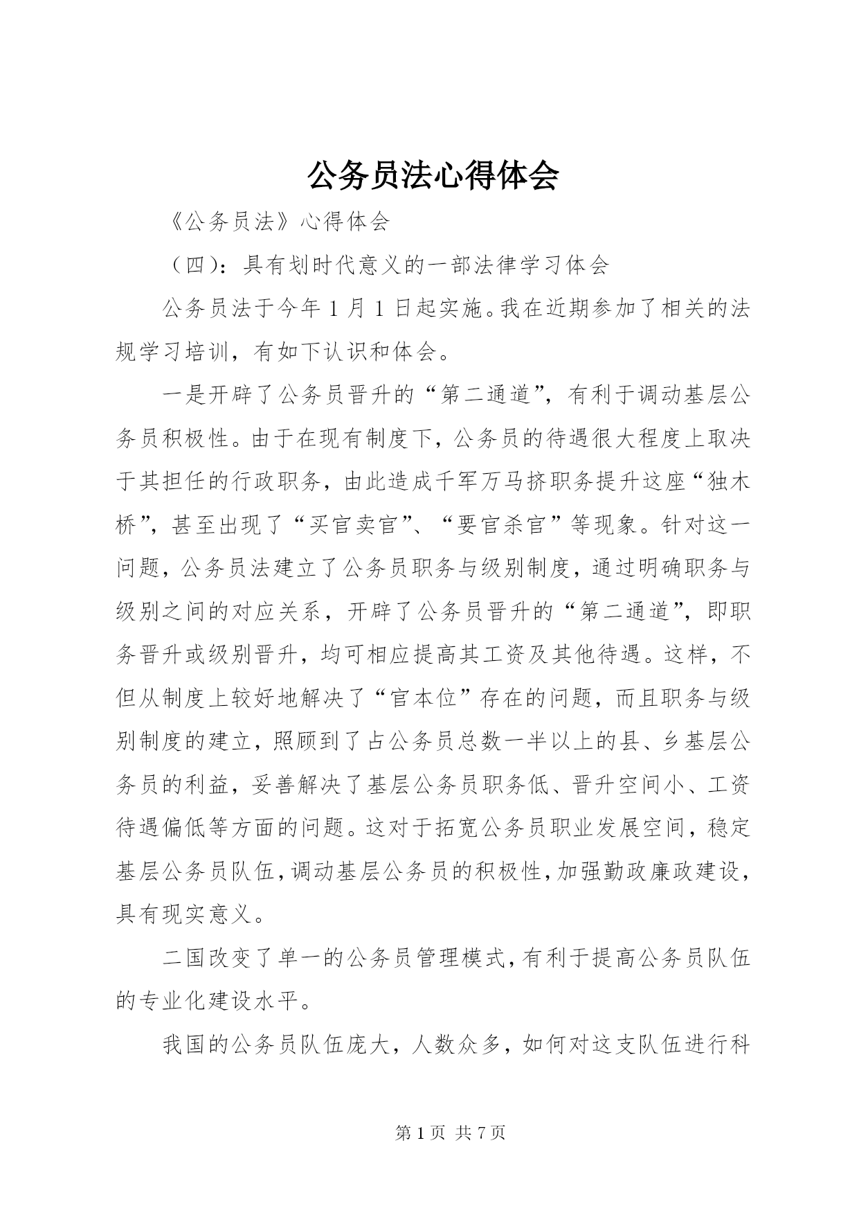 第PAGE\*Arabic\*MERGEFORMAT7页共NUMPAGES\*MERGEFORMAT7页公务员法心得体会《公务员法》心得体会(四):具有划时代意义的一部法律学习体会公务员法于今年1月1日起实施。我在近期参加了相关的法规学习培训,有如下认识和体会。一是开辟了公务员晋升的“第二通道”,有利于调动基层公务员积极性。由于在现有制度下,公务员的待遇很大程度上取决于其担任的行政职务,由此造成千军万马挤职务提升这座“独木桥”,甚至出现了“买官卖官”、“要官杀官”等现象。针对这一问题,公务员法