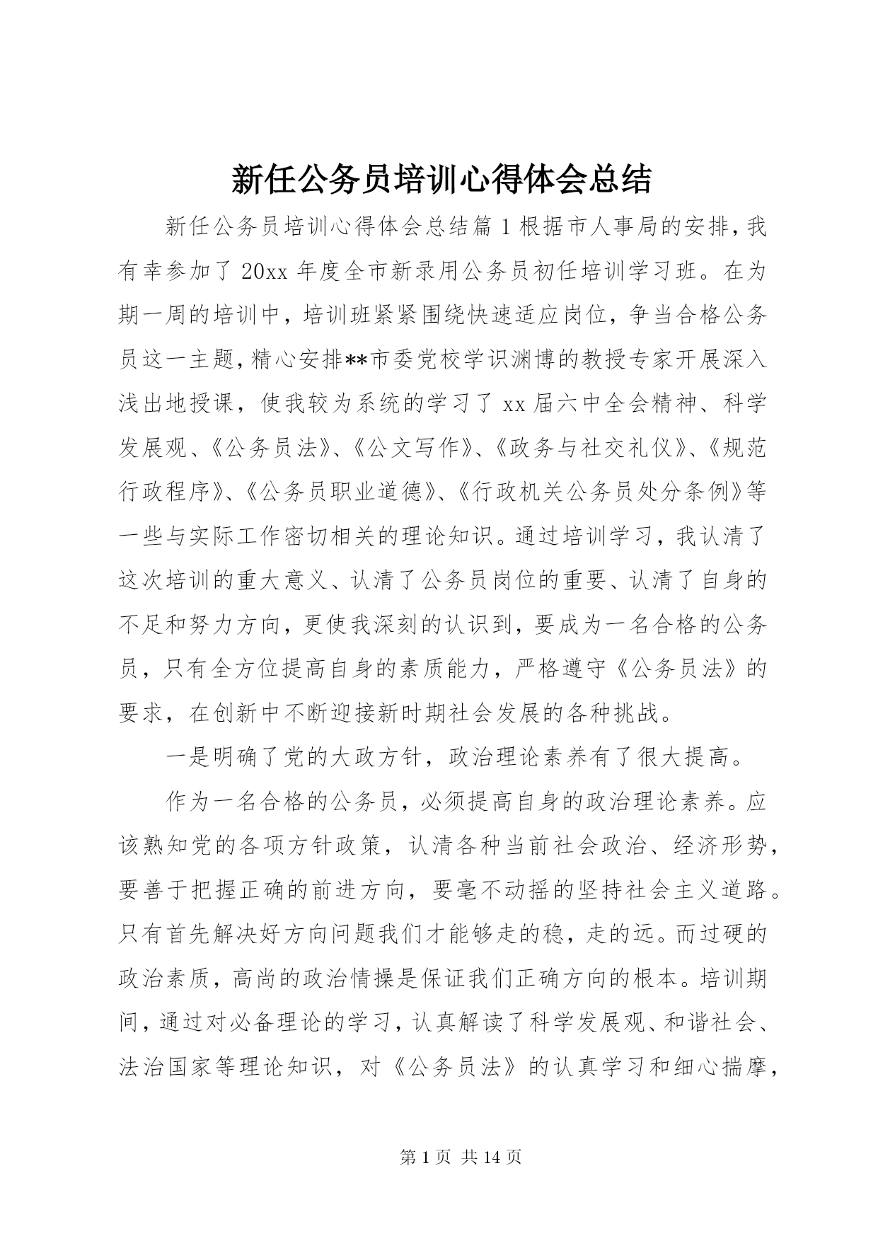 第PAGE\*Arabic\*MERGEFORMAT14页共NUMPAGES\*MERGEFORMAT14页新任公务员培训心得体会总结新任公务员培训心得体会总结篇1根据市人事局的安排,我有幸参加了20xx年度全市新录用公务员初任培训学习班。在为期一周的培训中,培训班紧紧围绕快速适应岗位,争当合格公务员这一主题,精心安排**市委党校学识渊博的教授专家开展深入浅出地授课,使我较为系统的学习了xx届六中全会精神、科学发展观、《公务员法》、《公文写作》、《政务与社交礼仪》、《规范行政程序》、《公务员职
