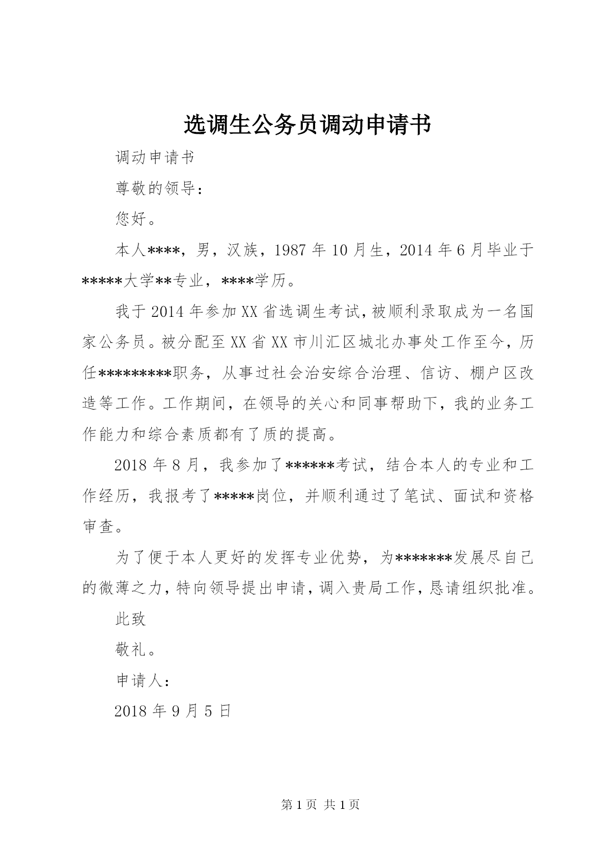 第PAGE\*Arabic\*MERGEFORMAT1页共NUMPAGES\*MERGEFORMAT1页选调生公务员调动申请书调动申请书尊敬的领导:您好。本人****,男,汉族,1987年10月生,2014年6月毕业于*****大学**专业,****学历。我于2014年参加XX省选调生考试,被顺利录取成为一名国家公务员。被分配至XX省XX市川汇区城北办事处工作至今,历任*********职务,从事过社会治安综合治理、信访、棚户区改造等工作。工作期间,在领导的关心和同事帮助下,我的业务工作能力和