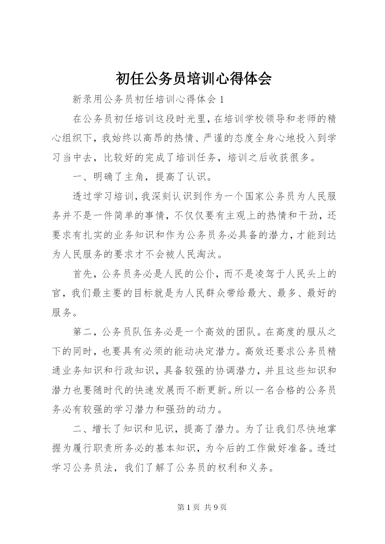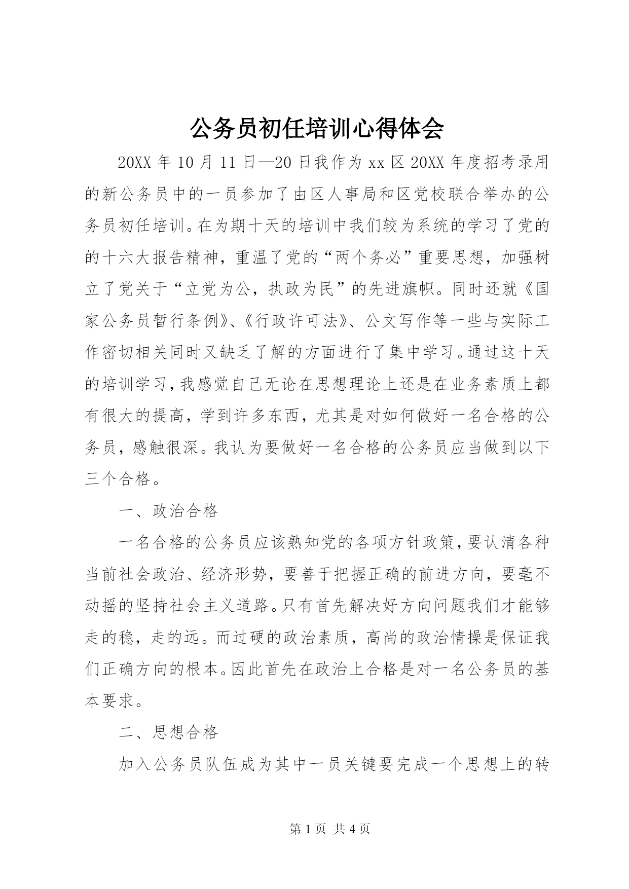 第PAGE\*Arabic\*MERGEFORMAT4页共NUMPAGES\*MERGEFORMAT4页公务员初任培训心得体会20XX年10月11日—20日我作为xx区20XX年度招考录用的新公务员中的一员参加了由区人事局和区党校联合举办的公务员初任培训。在为期十天的培训中我们较为系统的学习了党的的十六大报告精神,重温了党的“两个务必”重要思想,加强树立了党关于“立党为公,执政为民”的先进旗帜。同时还就《国家公务员暂行条例》、《行政许可法》、公文写作等一些与实际工作密切相关同时又缺乏了解的方面