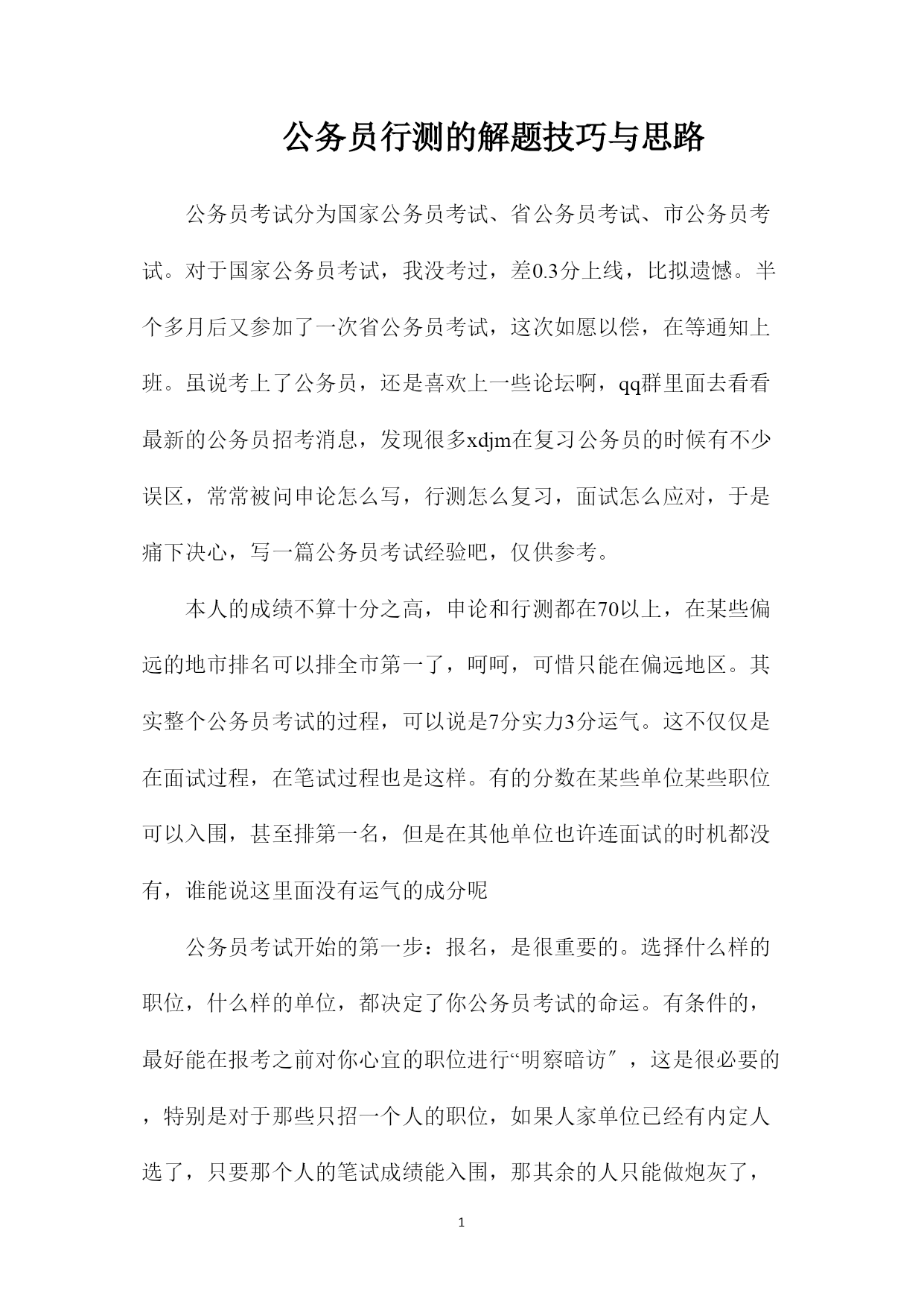 PAGEPAGE7公务员行测的解题技巧与思路公务员考试分为国家公务员考试、省公务员考试、市公务员考试。对于国家公务员考试,我没考过,差0.3分上线,比拟遗憾。半个多月后又参加了一次省公务员考试,这次如愿以偿,在等通知上班。虽说考上了公务员,还是喜欢上一些论坛啊,qq群里面去看看最新的公务员招考消息,发现很多xdjm在复习公务员的时候有不少误区,常常被问申论怎么写,行测怎么复习,面试怎么应对,于是痛下决心,写一篇公务员考试经验吧,仅供参考。本人的成绩不算十分之高,申论和行测都在70以上,在某些偏