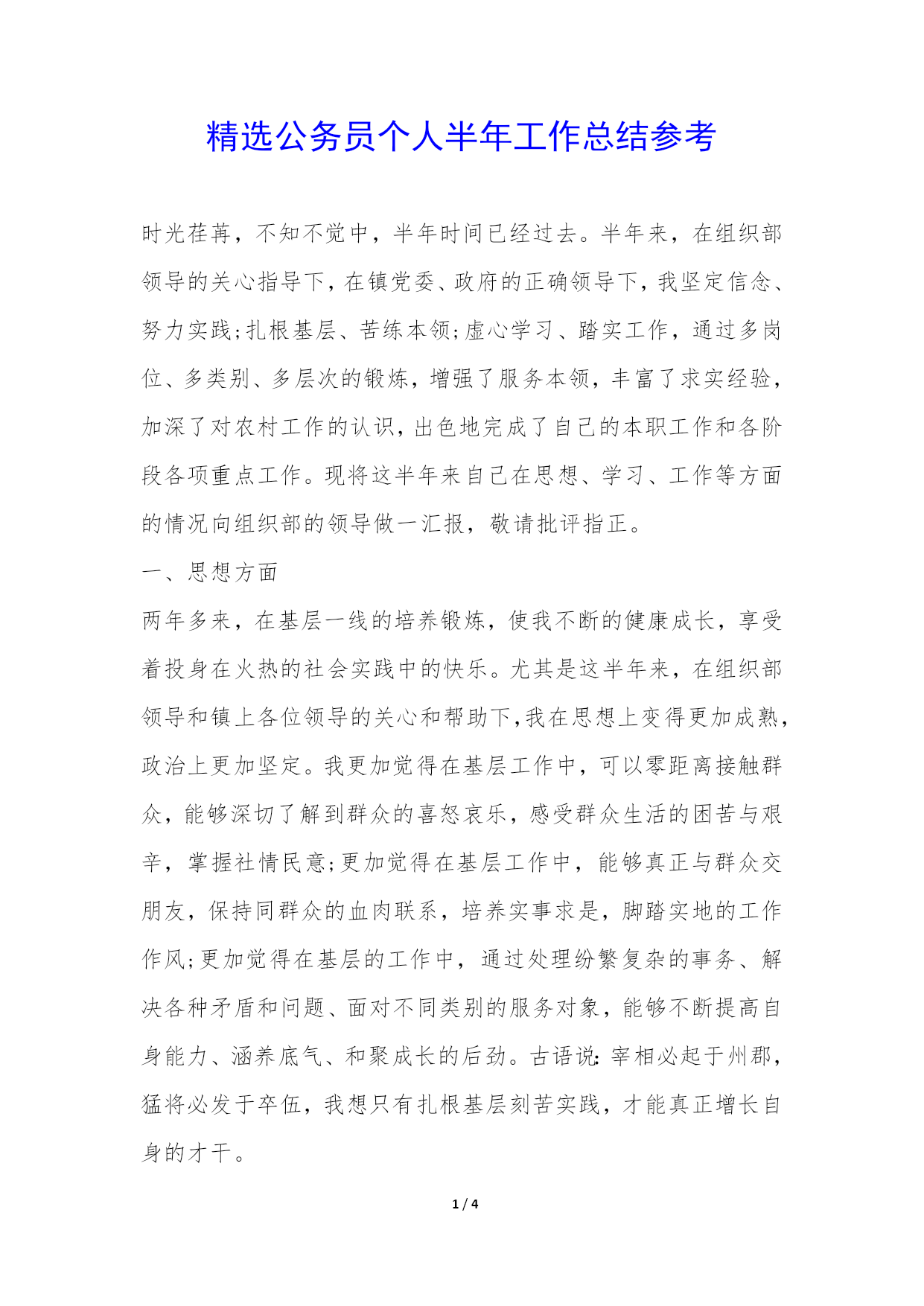 PAGE4/NUMPAGES4精选公务员个人半年工作总结参考时光荏苒,不知不觉中,半年时间已经过去。半年来,在组织部领导的关心指导下,在镇党委、政府的正确领导下,我坚定信念、努力实践;扎根基层、苦练本领;虚心学习、踏实工作,通过多岗位、多类别、多层次的锻炼,增强了服务本领,丰富了求实经验,加深了对农村工作的认识,出色地完成了自己的本职工作和各阶段各项重点工作。现将这半年来自己在思想、学习、工作等方面的情况向组织部的领导做一汇报,敬请批评指正。一、思想方面两年多来,在基层一线的培养锻炼,使我不断