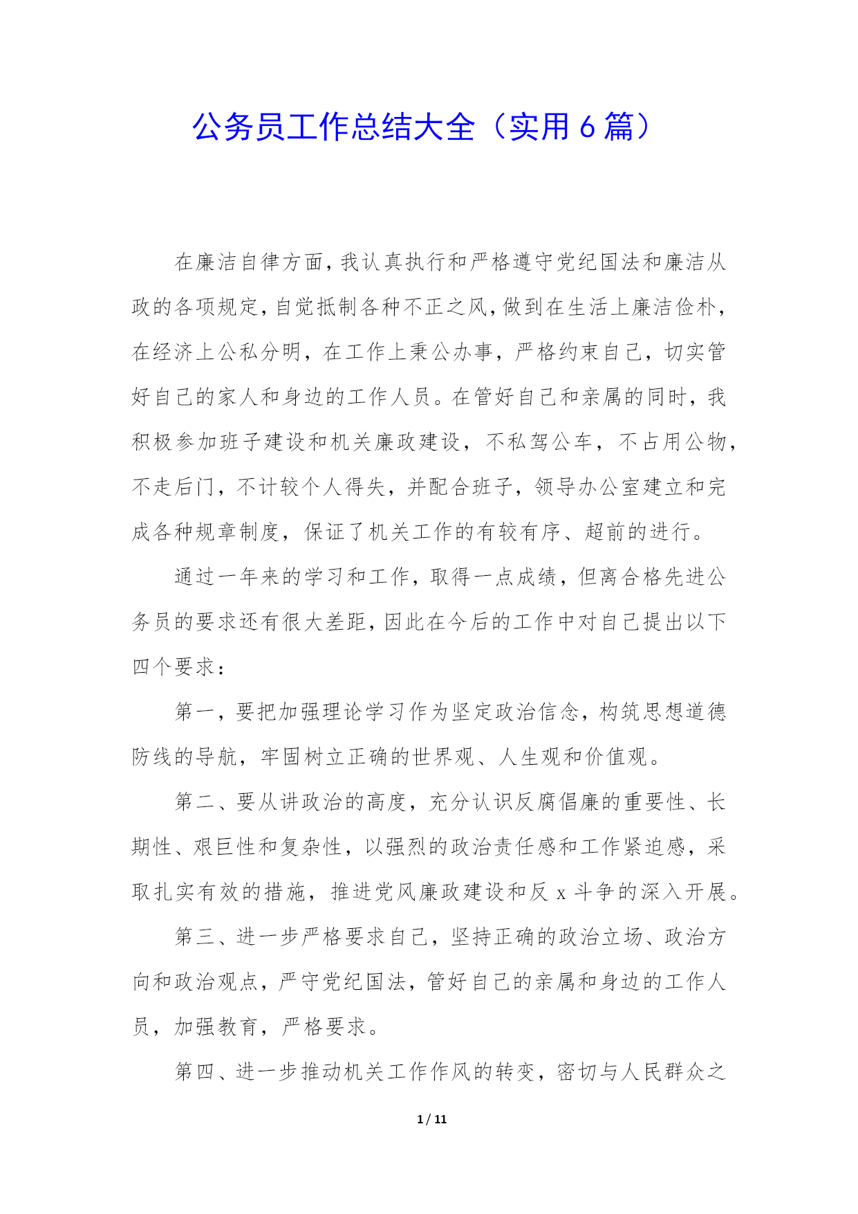 PAGE11/NUMPAGES11公务员工作总结大全(实用6篇)在廉洁自律方面,我认真执行和严格遵守党纪国法和廉洁从政的各项规定,自觉抵制各种不正之风,做到在生活上廉洁俭朴,在经济上公私分明,在工作上秉公办事,严格约束自己,切实管好自己的家人和身边的工作人员。在管好自己和亲属的同时,我积极参加班子建设和机关廉政建设,不私驾公车,不占用公物,不走后门,不计较个人得失,并配合班子,领导办公室建立和完成各种规章制度,保证了机关工作的有较有序、超前的进行。通过一年来的学习和工作,取得一点成绩,但离合格