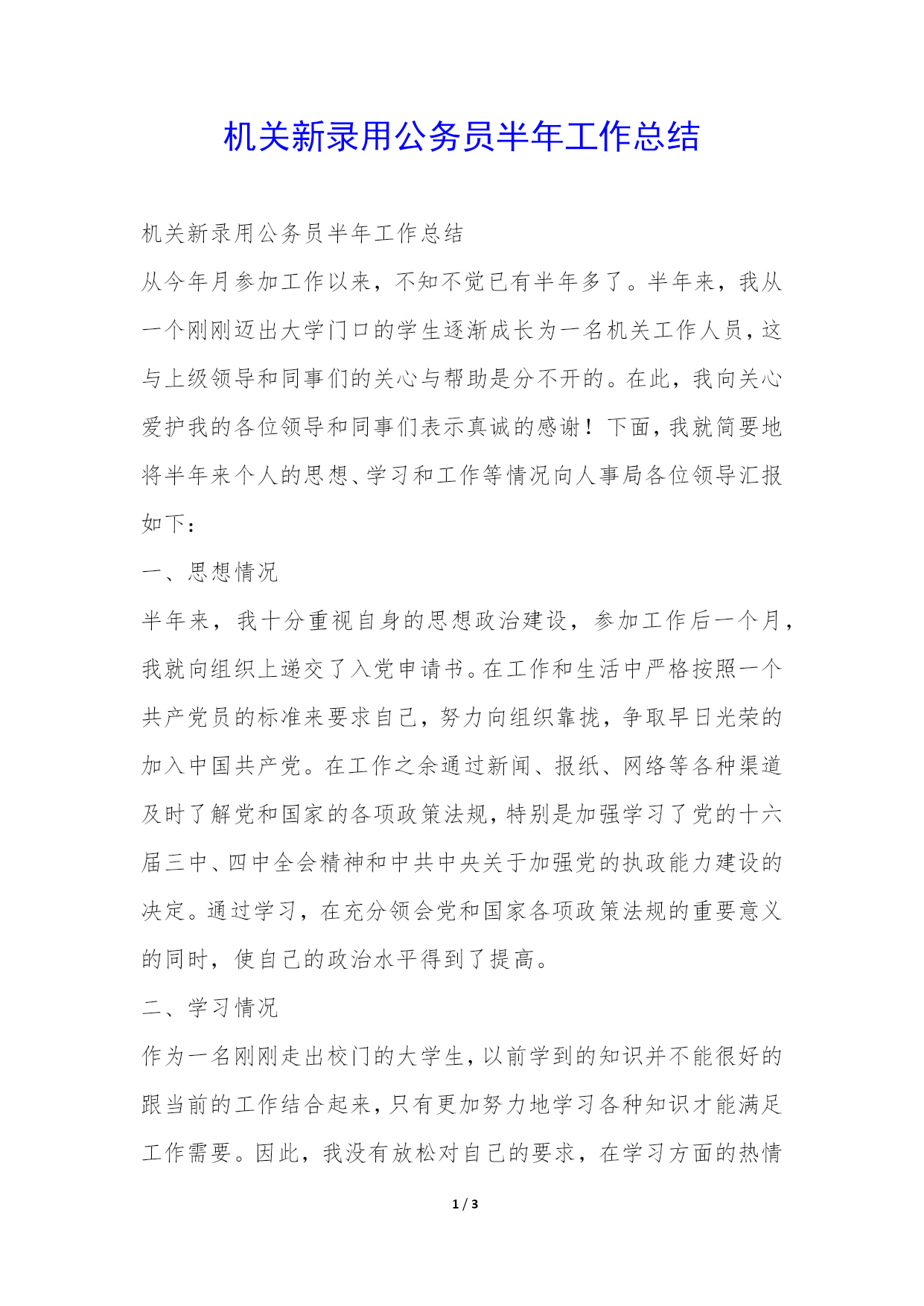 PAGE3/NUMPAGES3机关新录用公务员半年工作总结机关新录用公务员半年工作总结从今年月参加工作以来,不知不觉已有半年多了。半年来,我从一个刚刚迈出大学门口的学生逐渐成长为一名机关工作人员,这与上级领导和同事们的关心与帮助是分不开的。在此,我向关心爱护我的各位领导和同事们表示真诚的感谢!下面,我就简要地将半年来个人的思想、学习和工作等情况向人事局各位领导汇报如下:一、思想情况半年来,我十分重视自身的思想政治建设,参加工作后一个月,我就向组织上递交了入党申请书。在工作和生活中严格按照一个共