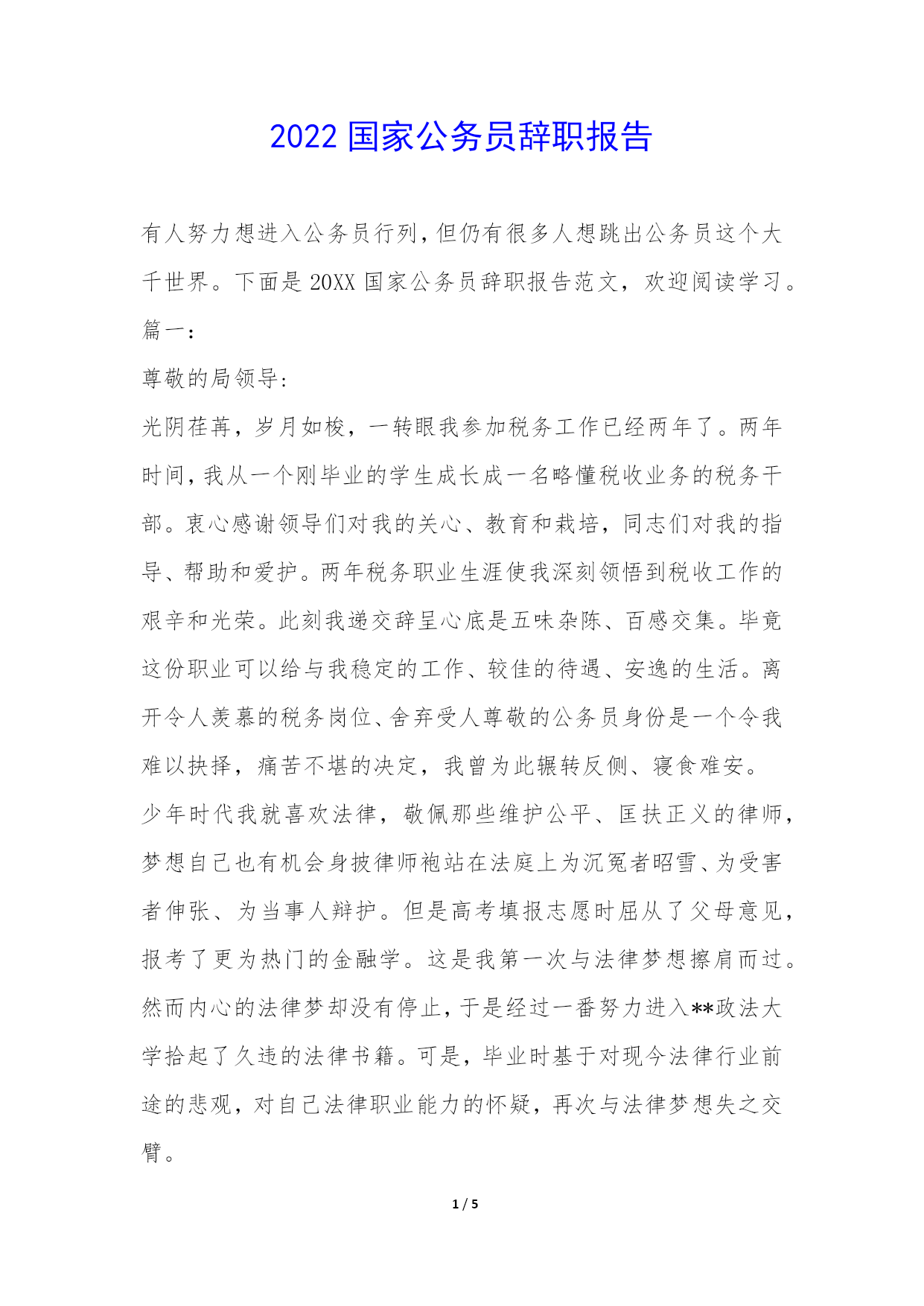PAGE5/NUMPAGES52022国家公务员辞职报告有人努力想进入公务员行列,但仍有很多人想跳出公务员这个大千世界。下面是20XX国家公务员辞职报告范文,欢迎阅读学习。篇一:尊敬的局领导:光阴荏苒,岁月如梭,一转眼我参加税务工作已经两年了。两年时间,我从一个刚毕业的学生成长成一名略懂税收业务的税务干部。衷心感谢领导们对我的关心、教育和栽培,同志们对我的指导、帮助和爱护。两年税务职业生涯使我深刻领悟到税收工作的艰辛和光荣。此刻我递交辞呈心底是五味杂陈、百感交集。毕竟这份职业可以给与我稳定的工