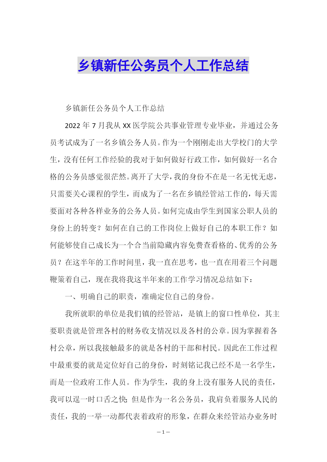 —PAGE\*MERGEFORMAT4—乡镇新任公务员个人工作总结乡镇新任公务员个人工作总结2022年7月我从XX医学院公共事业管理专业毕业,并通过公务员考试成为了一名乡镇公务人员。作为一个刚刚走出大学校门的大学生,没有任何工作经验的我对于如何做好行政工作,如何做好一名合格的公务员感觉很茫然。离开了大学,我的身份不在是一名无忧无虑,只需要关心课程的学生,而成为了一名在乡镇经管站工作的,每天需要面对各种各样业务的公务人员。如何完成由学生到国家公职人员的身份上的转变?如何在自己的工作岗位上做好自己的本职
