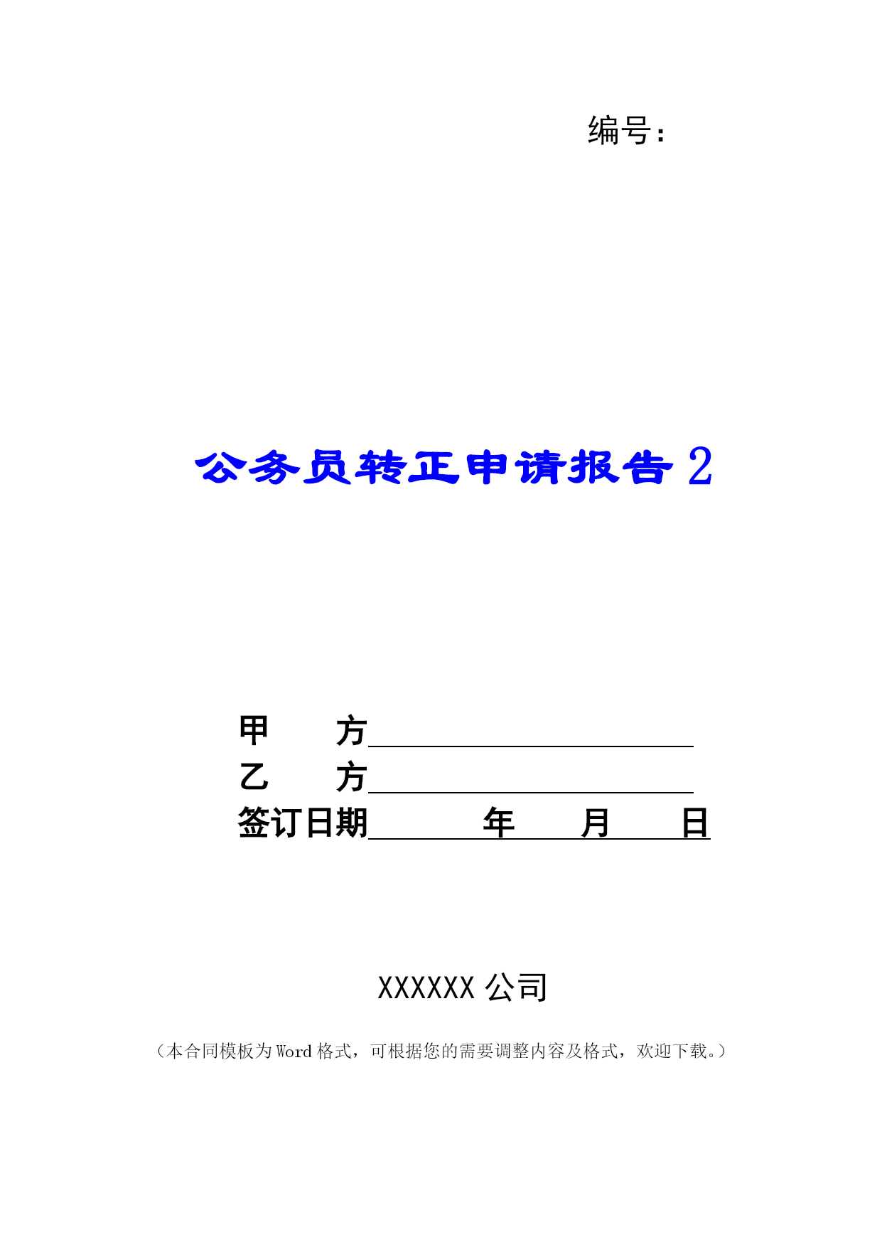 编号:公务员转正申请报告2甲方乙方签订日期年月日XXXXXX公司(本合同模板为Word格式,可根据您的需要调整内容及格式,欢迎下载。)尊敬的领导:200X年月份,大学刚刚毕业的我经过全省公务员录用考试被招录到***局,成为一名光荣的国家公务员。一年来,我在这个团结求实,温暖友爱的集体里,亲身感受到了组织的关怀,团结奋斗的快乐,在组织的培养教育下,我认真按照国家公务员的标准去做,加强政治学习,对业务精益求精,在见习期满之际,我郑重向领导提出转正申请。为了便于领导对我的考察,我将自己一年的实际工作情况向组织作
