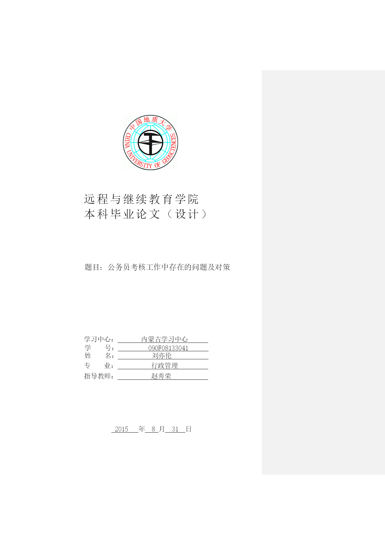 中国地质大学(武汉)远程与继续教育学院毕业设计(论文)PAGE远程与继续教育学院本科毕业论文(设计)题目:HYPERLINK"http://cugnc.cug.edu.cn/entity/workspaceStudent/student_toReSelectPaper.action"公务员考核工作中存在的问题及对策学习中心:内蒙古学习中心学号:090F08133041姓名:刘亦伦专业:行政管理指导教师:赵秀荣2015年8月31日中国地质大学(武汉)远程与继续教育学院本科毕业论文(设计)指导教师