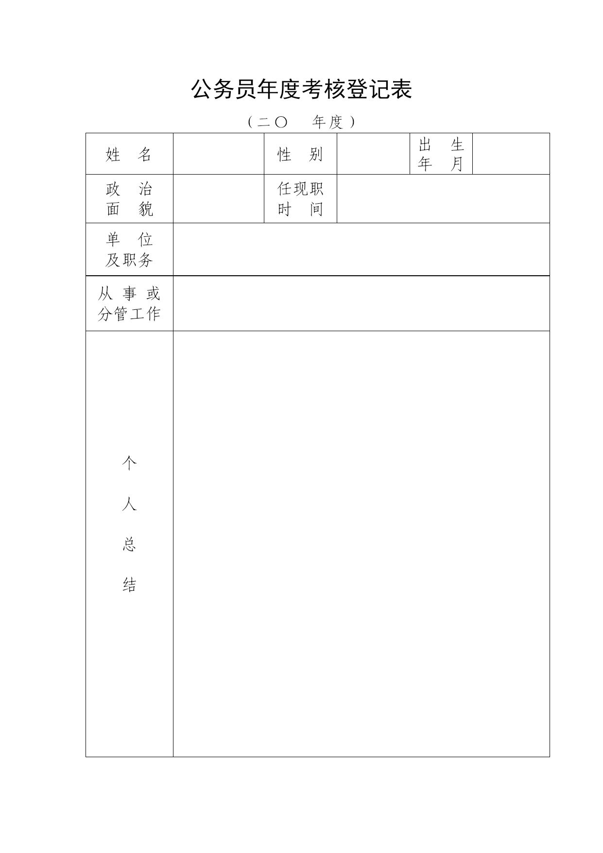 公务员年度考核登记表(二〇年度)姓名性别出生年月政治面貌任现职时间单位及职务从事或分管工作个人总结个人总结签名:年月日主管领导评语和考核等次建议签名:年月日机关负责人或考核委员会意见签名:年月日个人意见签名:年月日未确定等次或不参加考核情况说明签名:年月日