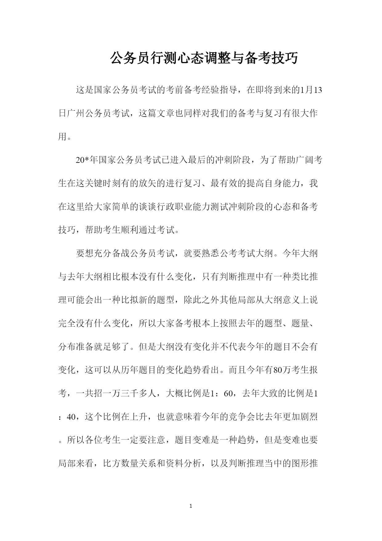 PAGEPAGE6公务员行测心态调整与备考技巧这是国家公务员考试的考前备考经验指导,在即将到来的1月13日广州公务员考试,这篇文章也同样对我们的备考与复习有很大作用。20*年国家公务员考试已进入最后的冲刺阶段,为了帮助广阔考生在这关键时刻有的放矢的进行复习、最有效的提高自身能力,我在这里给大家简单的谈谈行政职业能力测试冲刺阶段的心态和备考技巧,帮助考生顺利通过考试。要想充分备战公务员考试,就要熟悉公考考试大纲。今年大纲与去年大纲相比根本没有什么变化,只有判断推理中有一种类比推理可能会出一种比拟