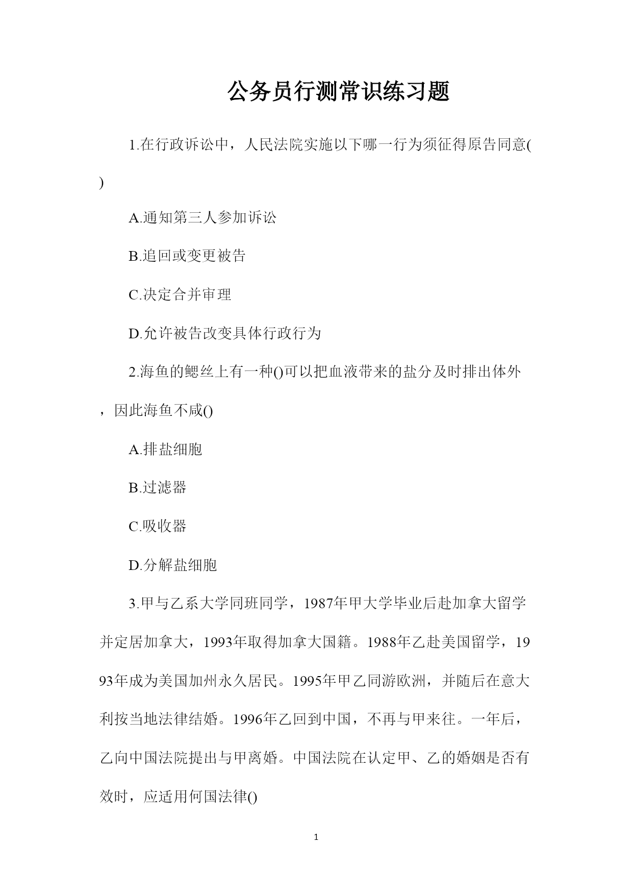 PAGEPAGE26公务员行测常识练习题1.在行政诉讼中,人民法院实施以下哪一行为须征得原告同意()A.通知第三人参加诉讼B.追回或变更被告C.决定合并审理D.允许被告改变具体行政行为2.海鱼的鳃丝上有一种()可以把血液带来的盐分及时排出体外,因此海鱼不咸()A.排盐细胞B.过滤器C.吸收器D.分解盐细胞3.甲与乙系大学同班同学,1987年甲大学毕业后赴加拿大留学并定居加拿大,1993年取得加拿大国籍。1988年乙赴美国留学,1993年成为美国加州永久居民。1995年甲乙同游欧洲,并随后在意大