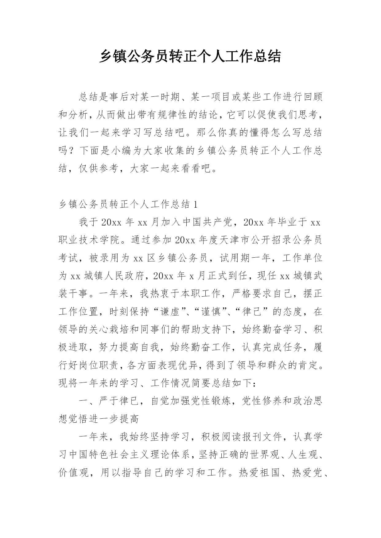 乡镇公务员转正个人工作总结总结是事后对某一时期、某一项目或某些工作进行回顾和分析,从而做出带有规律性的结论,它可以促使我们思考,让我们一起来学习写总结吧。那么你真的懂得怎么写总结吗?下面是小编为大家收集的乡镇公务员转正个人工作总结,仅供参考,大家一起来看看吧。乡镇公务员转正个人工作总结1我于20xx年xx月加入中国共产党,20xx年毕业于xx职业技术学院。通过参加20xx年度天津市公开招录公务员考试,被录用为xx区乡镇公务员,试用期一年,工作单位为xx城镇人民政府,20xx年x月正式到任,现任xx城镇武装