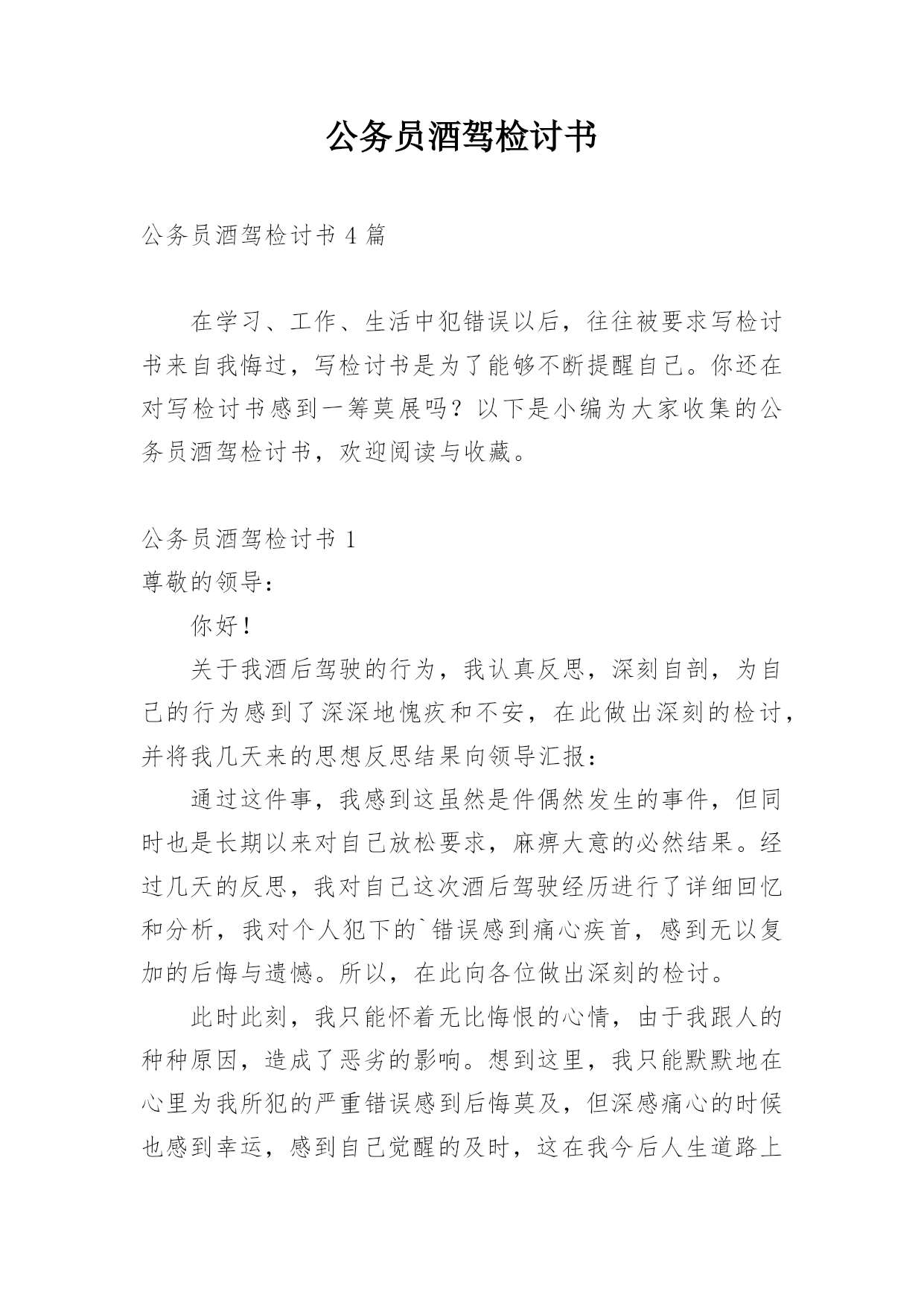 公务员酒驾检讨书公务员酒驾检讨书4篇在学习、工作、生活中犯错误以后,往往被要求写检讨书来自我悔过,写检讨书是为了能够不断提醒自己。你还在对写检讨书感到一筹莫展吗?以下是小编为大家收集的公务员酒驾检讨书,欢迎阅读与收藏。公务员酒驾检讨书1尊敬的领导:你好!关于我酒后驾驶的行为,我认真反思,深刻自剖,为自己的行为感到了深深地愧疚和不安,在此做出深刻的检讨,并将我几天来的思想反思结果向领导汇报:通过这件事,我感到这虽然是件偶然发生的事件,但同时也是长期以来对自己放松要求,麻痹大意的必然结果。经过几天的反思,我对