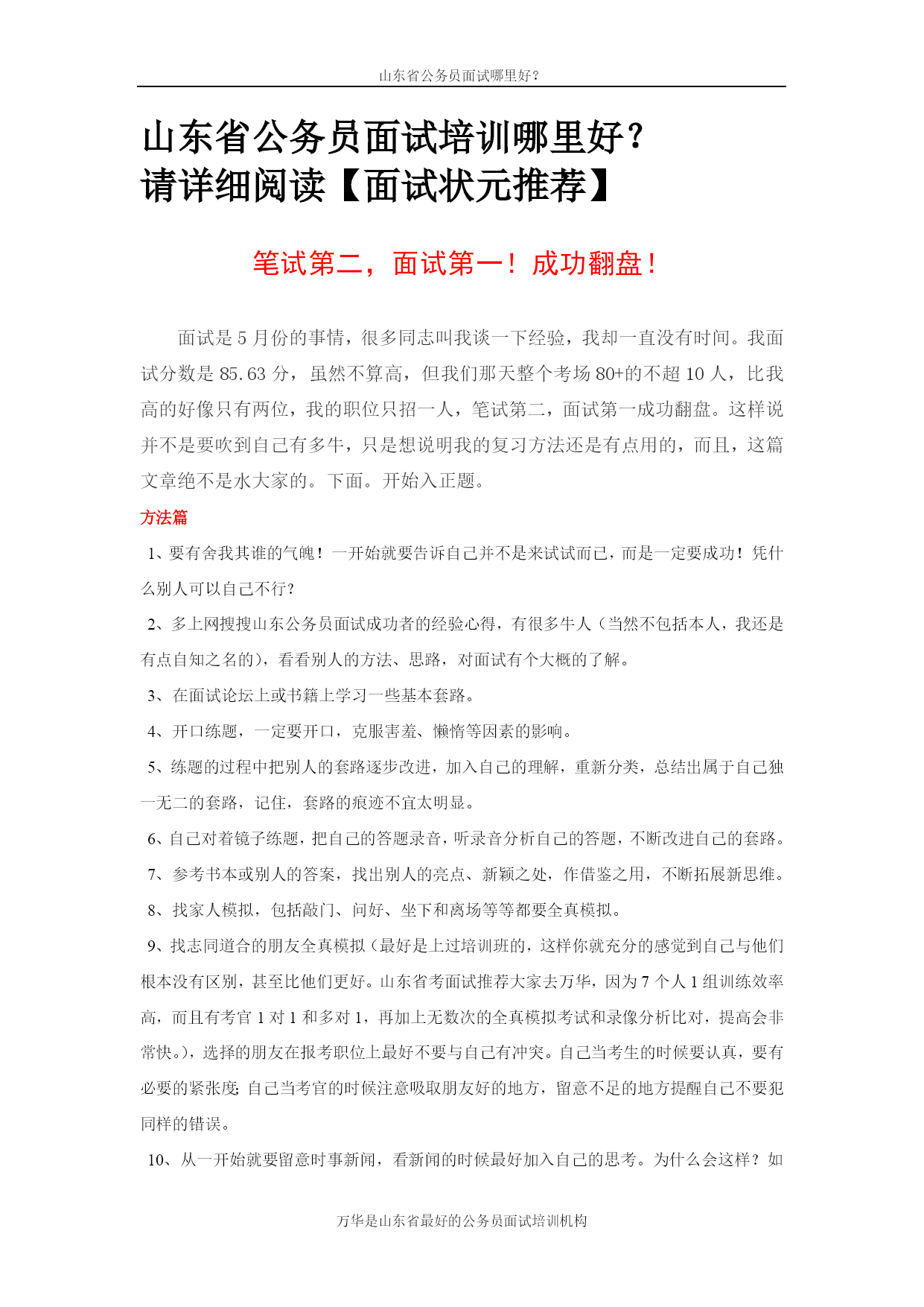 山东省公务员面试哪里好?万华是山东省最好的公务员面试培训机构山东省公务员面试培训哪里好?请详细阅读【面试状元推荐】笔试第二,面试第一!成功翻盘!面试是5月份的事情,很多同志叫我谈一下经验,我却一直没有时间。我面试分数是85.63分,虽然不算高,但我们那天整个考场80+的不超10人,比我高的好像只有两位,我的职位只招一人,笔试第二,面试第一成功翻盘。这样说并不是要吹到自己有多牛,只是想说明我的复习方法还是有点用的,而且,这篇文章绝不是水大家的。下面。开始入正题。方法篇1、要有舍我其谁的气魄!一开始就要告诉自