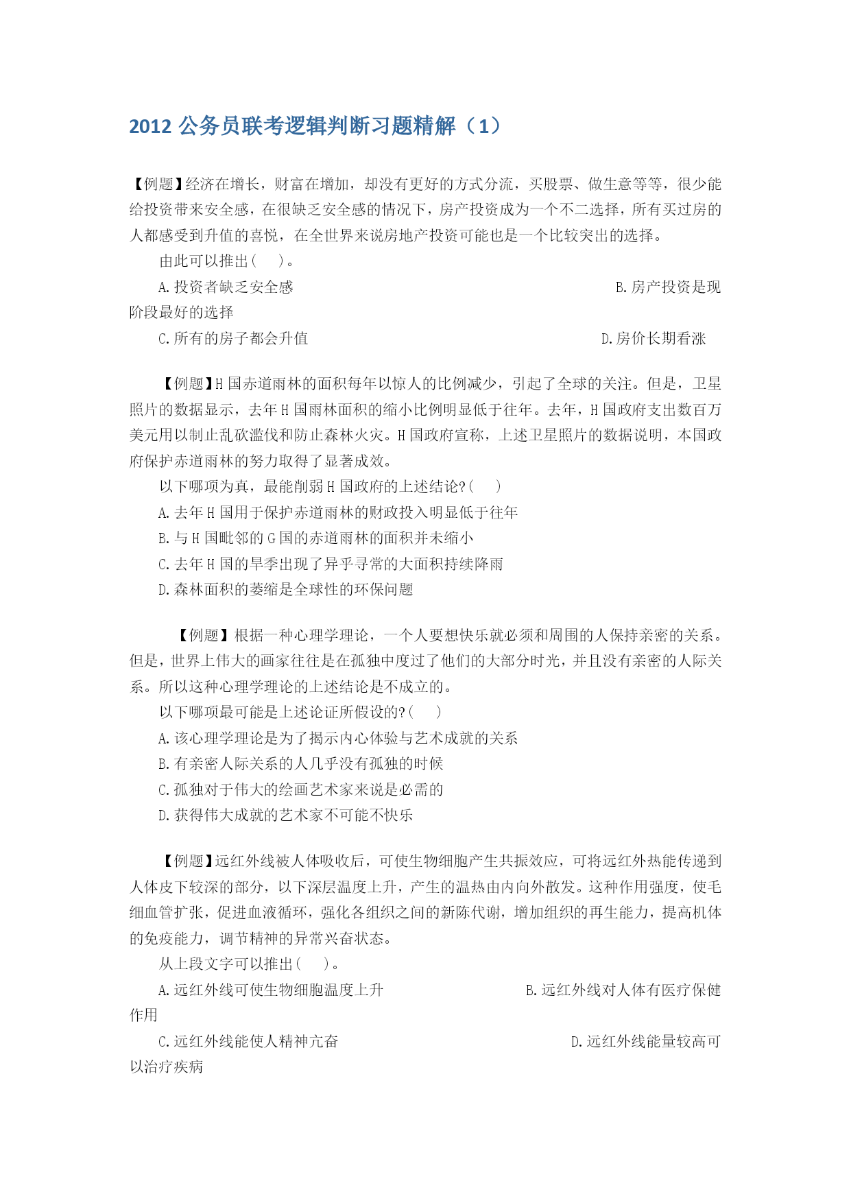 2012公务员联考逻辑判断习题精解(1)【例题】经济在增长,财富在增加,却没有更好的方式分流,买股票、做生意等等,很少能给投资带来安全感,在很缺乏安全感的情况下,房产投资成为一个不二选择,所有买过房的人都感受到升值的喜悦,在全世界来说房地产投资可能也是一个比较突出的选择。由此可以推出()。A.投资者缺乏安全感B.房产投资是现阶段最好的选择C.所有的房子都会升值D.房价长期看涨【例题】H国赤道雨林的面积每年以惊人的比例减少,引起了全球的关注。但是,卫星照片的数据显示,去年H国雨林面积的缩小比例明显低于往年。