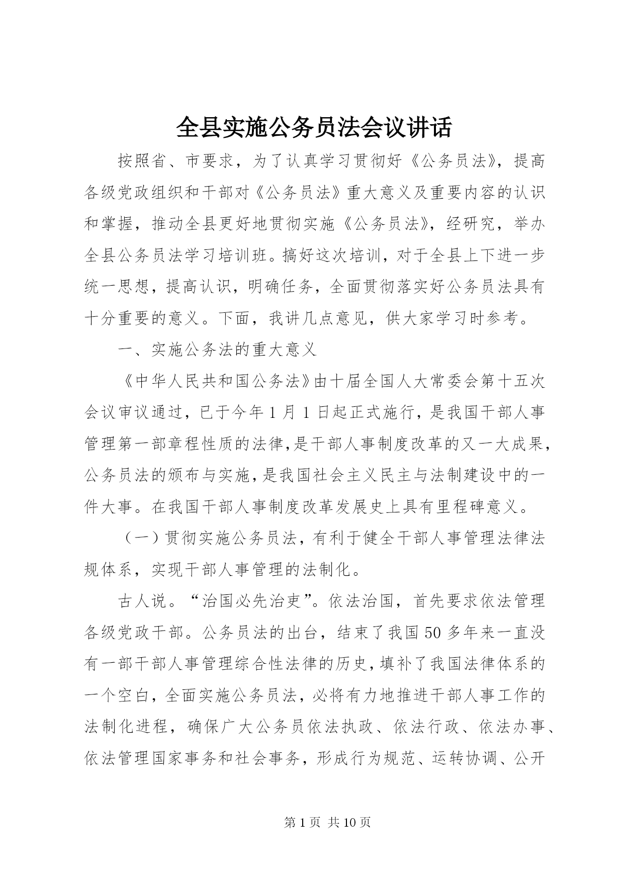 第PAGE\*Arabic\*MERGEFORMAT10页共NUMPAGES\*MERGEFORMAT10页全县实施公务员法会议讲话按照省、市要求,为了认真学习贯彻好《公务员法》,提高各级党政组织和干部对《公务员法》重大意义及重要内容的认识和掌握,推动全县更好地贯彻实施《公务员法》,经研究,举办全县公务员法学习培训班。搞好这次培训,对于全县上下进一步统一思想,提高认识,明确任务,全面贯彻落实好公务员法具有十分重要的意义。下面,我讲几点意见,供大家学习时参考。一、实施公务法的重大意义《中华人民共