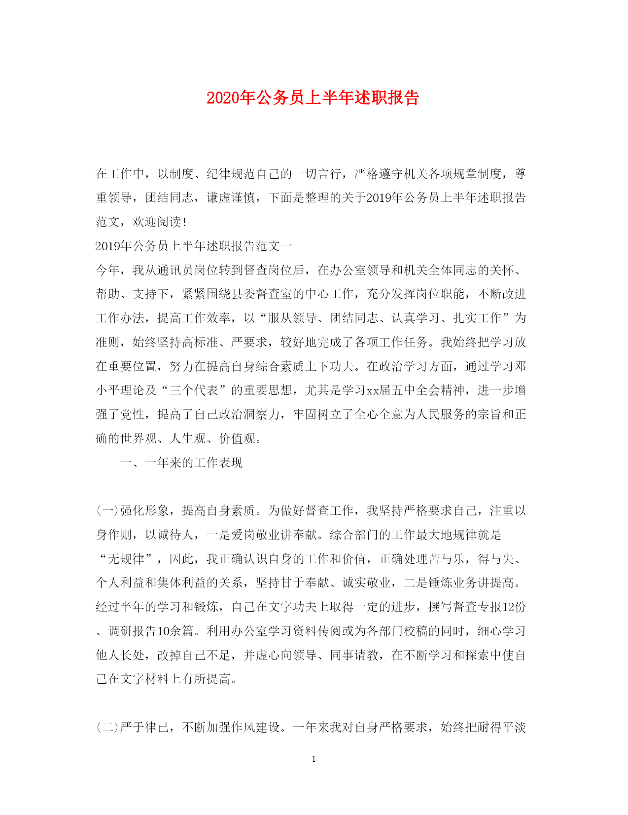 此资料由网络收集而来,如有侵权请告知上传者立即删除。资料共分享,我们负责传递知识。PAGEPAGE62020年公务员上半年述职报告在工作中,以制度、纪律规范自己的一切言行,严格遵守机关各项规章制度,尊重领导,团结同志,谦虚谨慎,下面是整理的关于2019年公务员上半年述职报告范文,欢迎阅读!2019年公务员上半年述职报告范文一今年,我从通讯员岗位转到督查岗位后,在办公室领导和机关全体同志的关怀、帮助、支持下,紧紧围绕县委督查室的中心工作,充分发挥岗位职能,不断改进工作办法,提高工作效率,以“服从