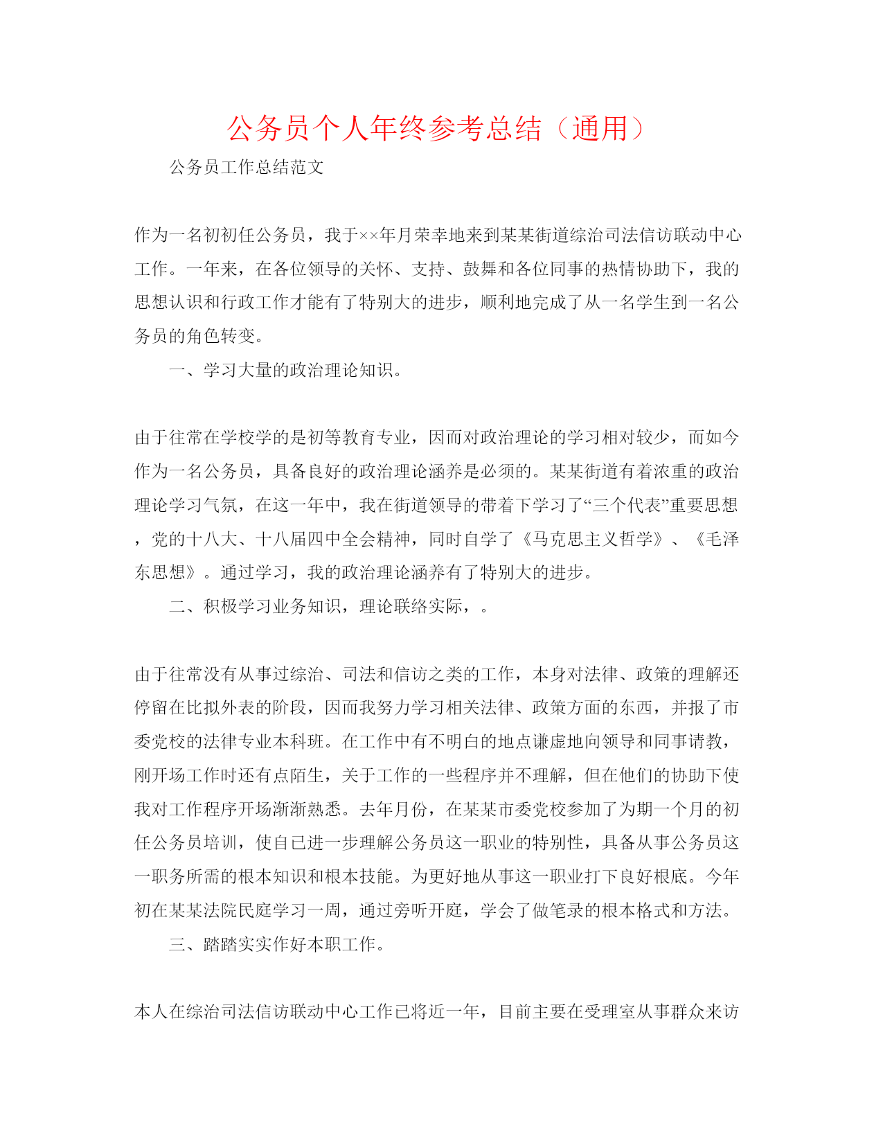 公务员个人年终参考总结(通用)公务员工作总结范文作为一名初初任公务员,我于××年月荣幸地来到某某街道综治司法信访联动中心工作。一年来,在各位领导的关怀、支持、鼓舞和各位同事的热情协助下,我的思想认识和行政工作才能有了特别大的进步,顺利地完成了从一名学生到一名公务员的角色转变。一、学习大量的政治理论知识。由于往常在学校学的是初等教育专业,因而对政治理论的学习相对较少,而如今作为一名公务员,具备良好的政治理论涵养是必须的。某某街道有着浓重的政治理论学习气氛,在这一年中,我在街道领导的带着下学习了“三个代表”重