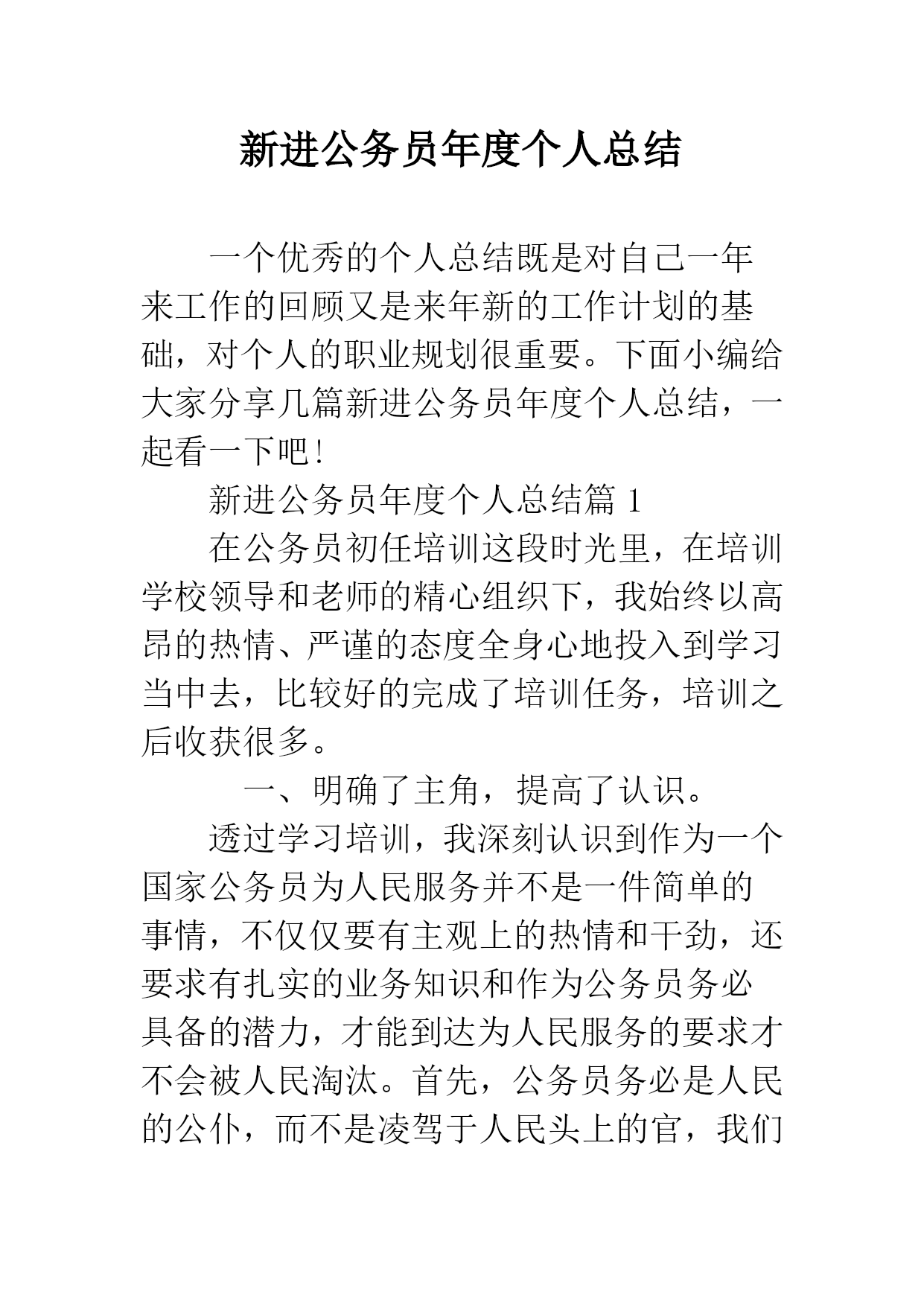 新进公务员年度个人总结一个优秀的个人总结既是对自己一年来工作的回顾又是来年新的工作计划的基础,对个人的职业规划很重要。下面小编给大家分享几篇新进公务员年度个人总结,一起看一下吧!新进公务员年度个人总结篇1在公务员初任培训这段时光里,在培训学校领导和老师的精心组织下,我始终以高昂的热情、严谨的态度全身心地投入到学习当中去,比较好的完成了培训任务,培训之后收获很多。一、明确了主角,提高了认识。透过学习培训,我深刻认识到作为一个国家公务员为人民服务并不是一件简单的事情,不仅仅要有主观上的热情和干劲,还要求有扎实