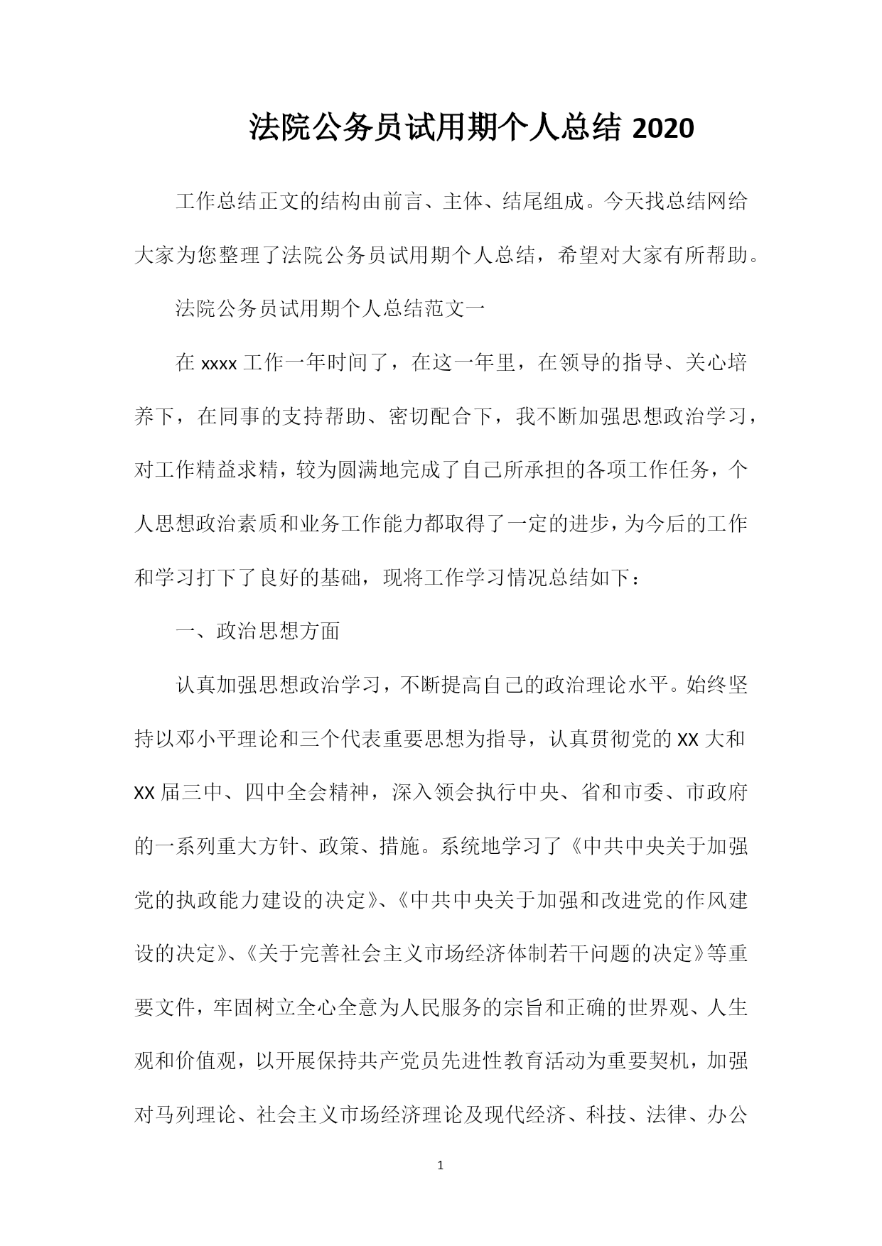 PAGEPAGE9法院公务员试用期个人总结2020工作总结正文的结构由前言、主体、结尾组成。今天找总结网给大家为您整理了法院公务员试用期个人总结,希望对大家有所帮助。法院公务员试用期个人总结范文一在xxxx工作一年时间了,在这一年里,在领导的指导、关心培养下,在同事的支持帮助、密切配合下,我不断加强思想政治学习,对工作精益求精,较为圆满地完成了自己所承担的各项工作任务,个人思想政治素质和业务工作能力都取得了一定的进步,为今后的工作和学习打下了良好的基础,现将工作学习情况总结如下:一、政治思想方